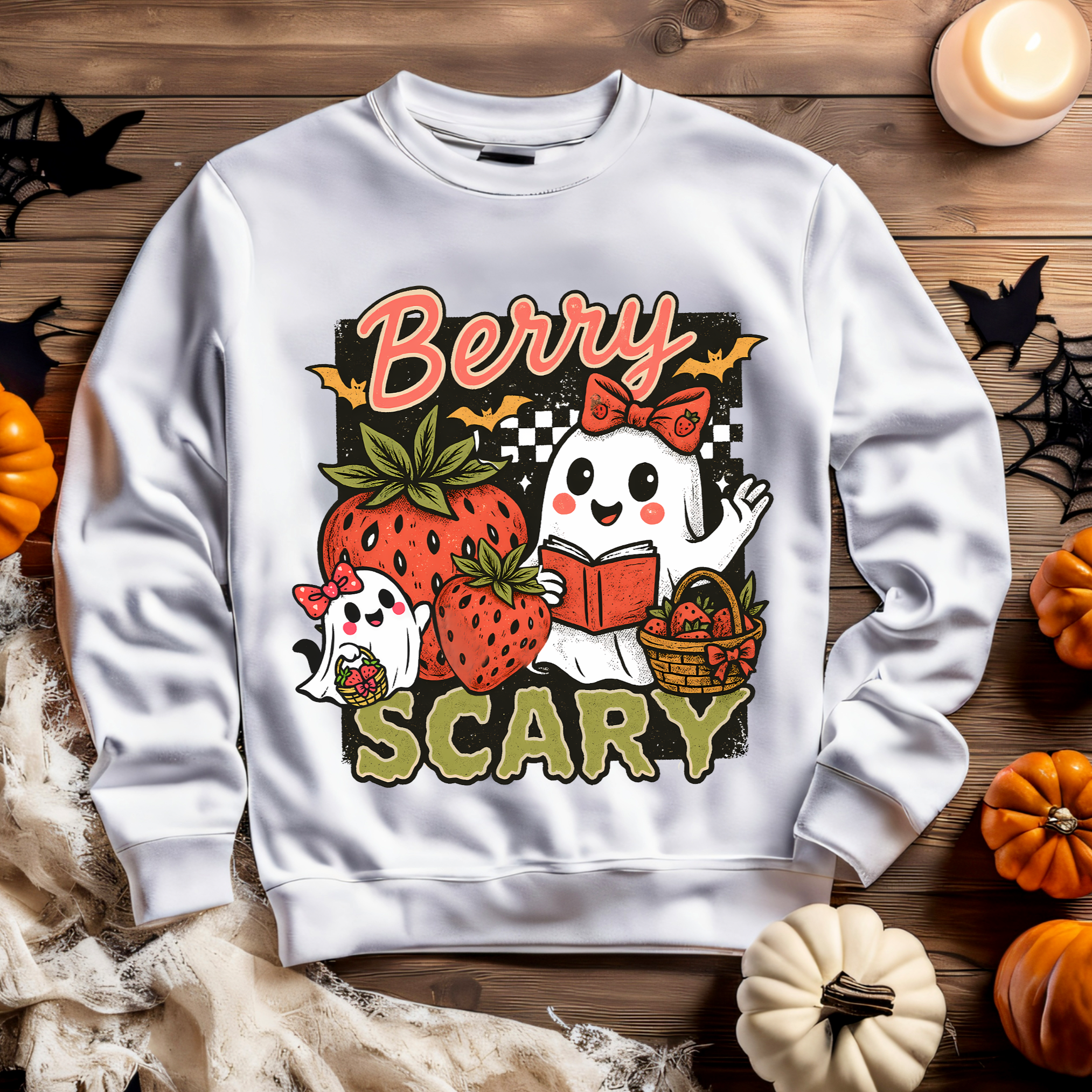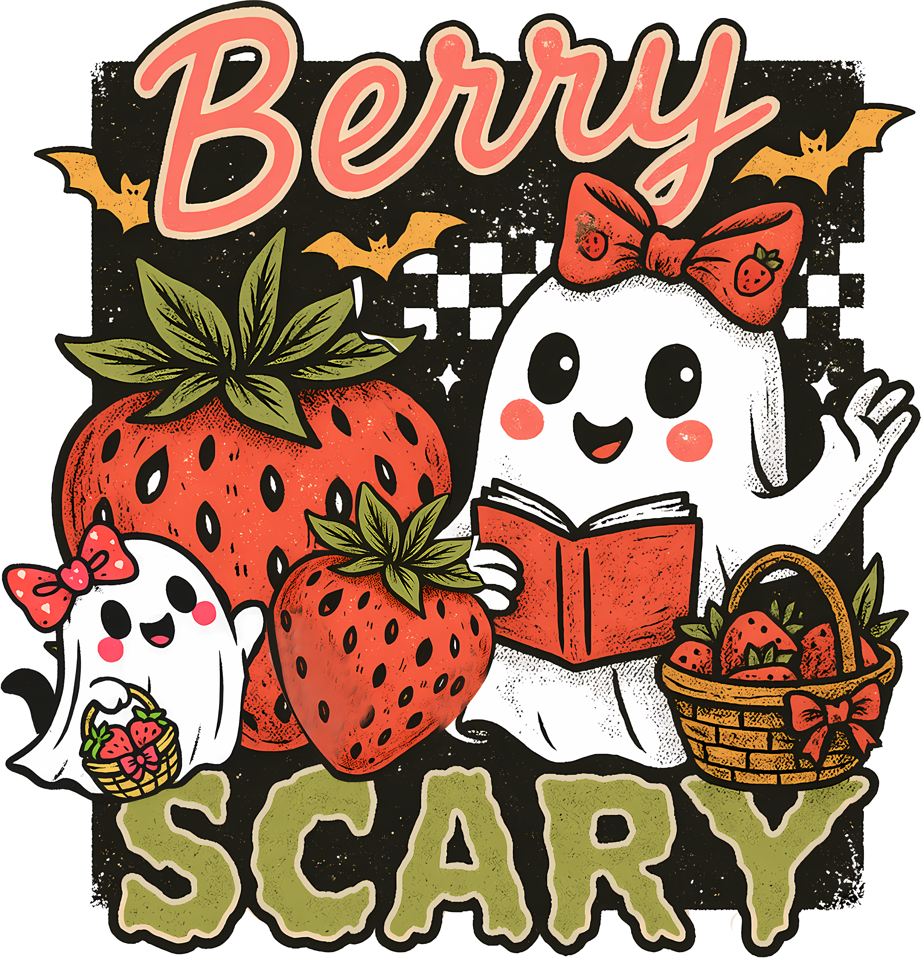 This "Berry Scary" DTF transfer is the perfect blend of spooky fun and cottagecore charm. Featuring adorable ghosts enjoying a day of reading and strawberry picking, this design is a delightful twist on Halloween. With its retro font, checkerboard details, and sweet strawberry bows, it’s perfect for anyone who prefers their spooky season with a side of sweetness.