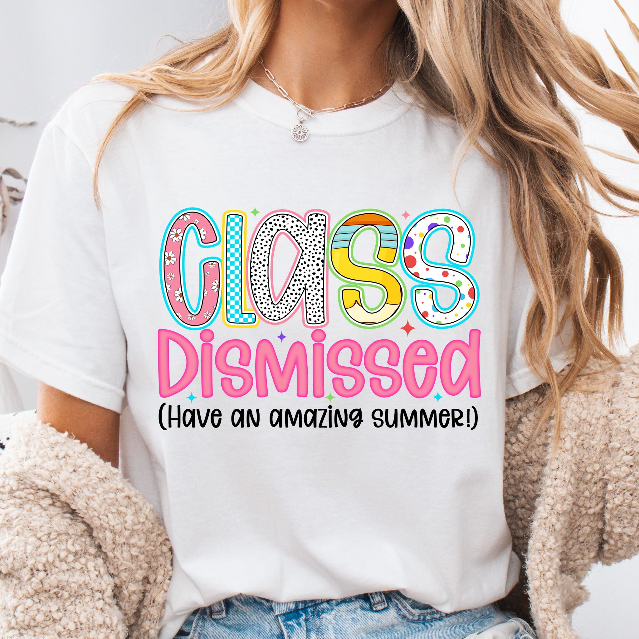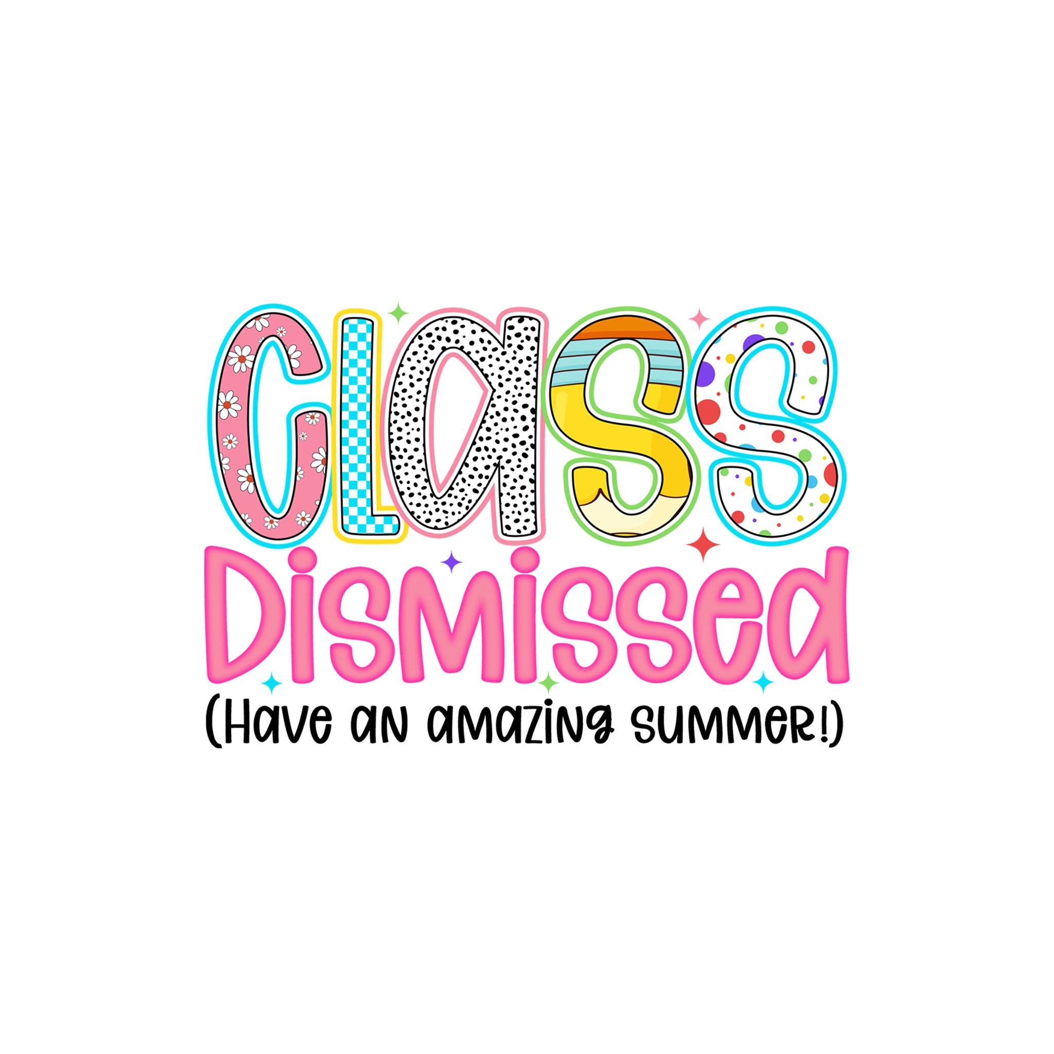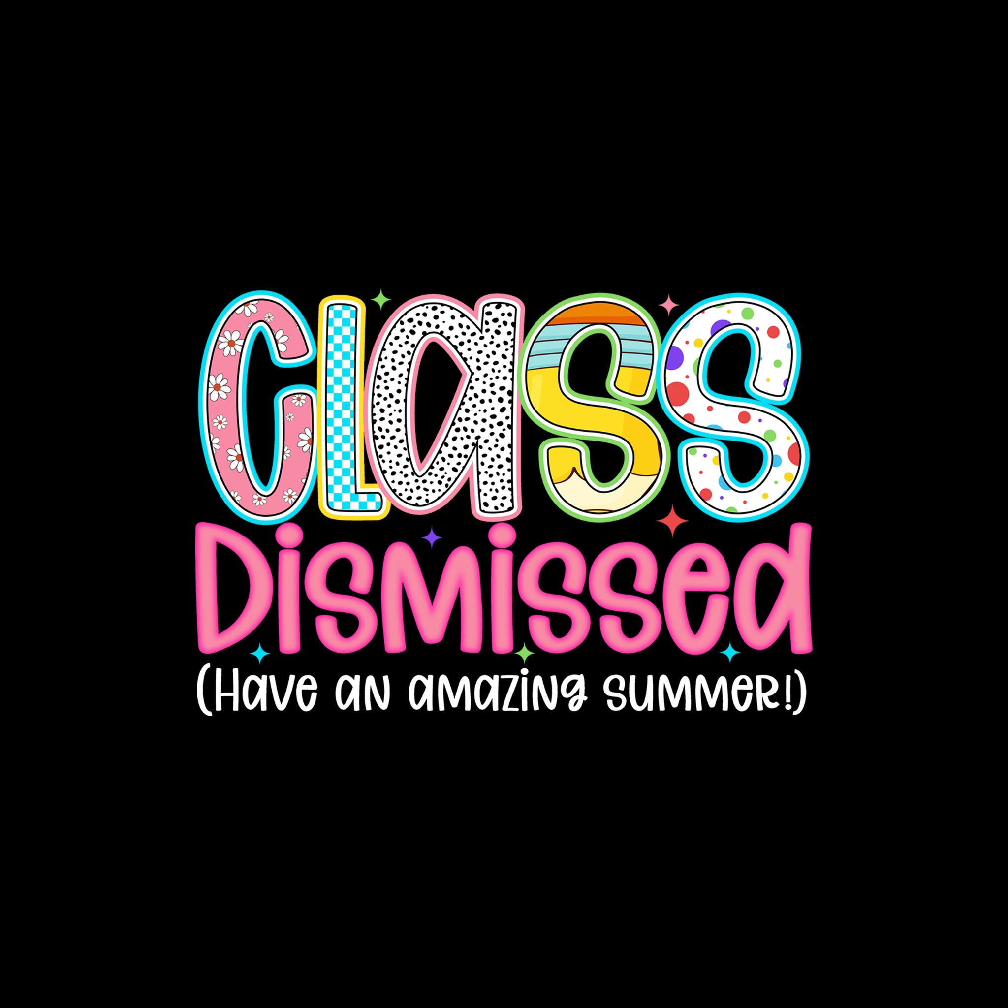 Get ready to ring the final bell and jump right into summer break! Our Colorful Class Dismissed - Have an Amazing Summer DTF transfer brings a fun, energetic vibe to the end of the school year. This vibrant design features the word "CLASS" in large, playful bubble letters filled with trendy mixed patterns like florals, bright checkers, dalmatian spots, retro stripes, and colorful polka dots. It is perfectly paired with bold pink lettering and a sweet message wishing everyone an amazing summer.