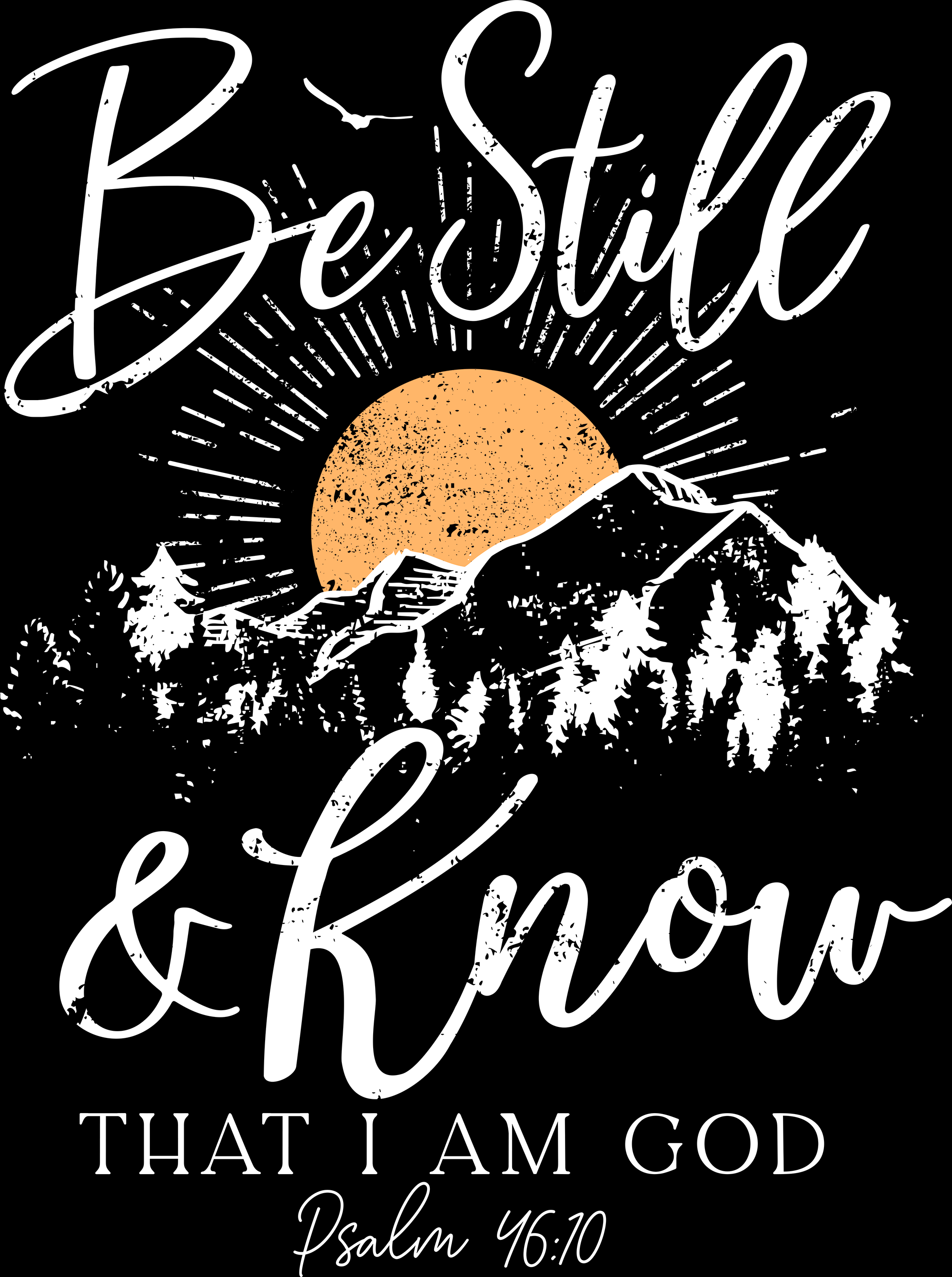 Wear a daily reminder of peace and faith with our "Be Still & Know" DTF transfer. This stunning design features a rustic mountain landscape, towering pine trees, and a warm, rising sun, perfectly framing the powerful scripture from Psalm 46:10: "Be Still & Know That I Am God."