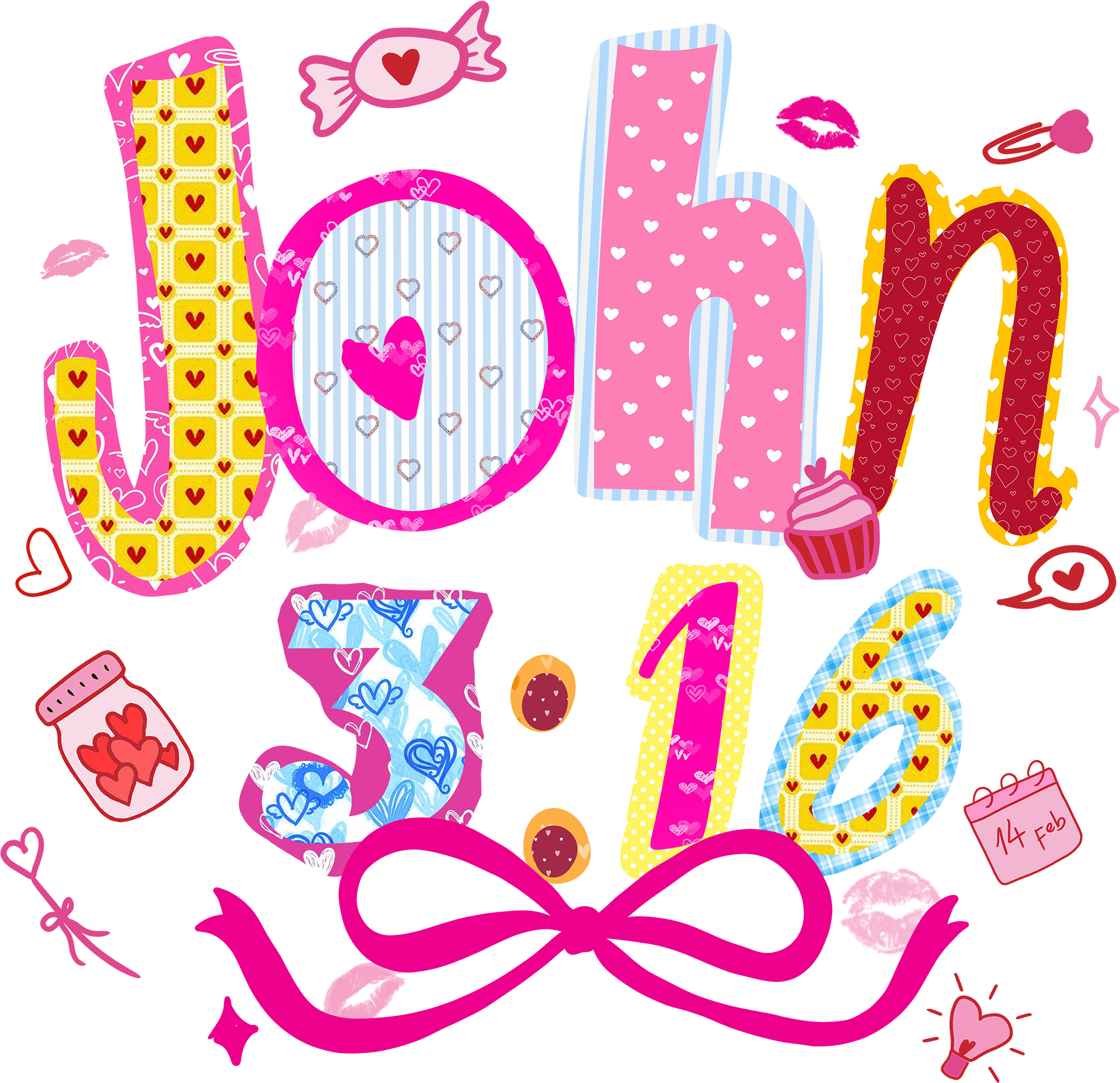 Celebrate the true meaning of love this Valentine's Day with our colorful "John 3:16" DTF transfer. This design takes your favorite bible verse and wraps it up in pure sweetness! The bold "John 3:16" lettering is filled with a fun mix of patterns—from sunny yellow checks and blue stripes to classic pink hearts.