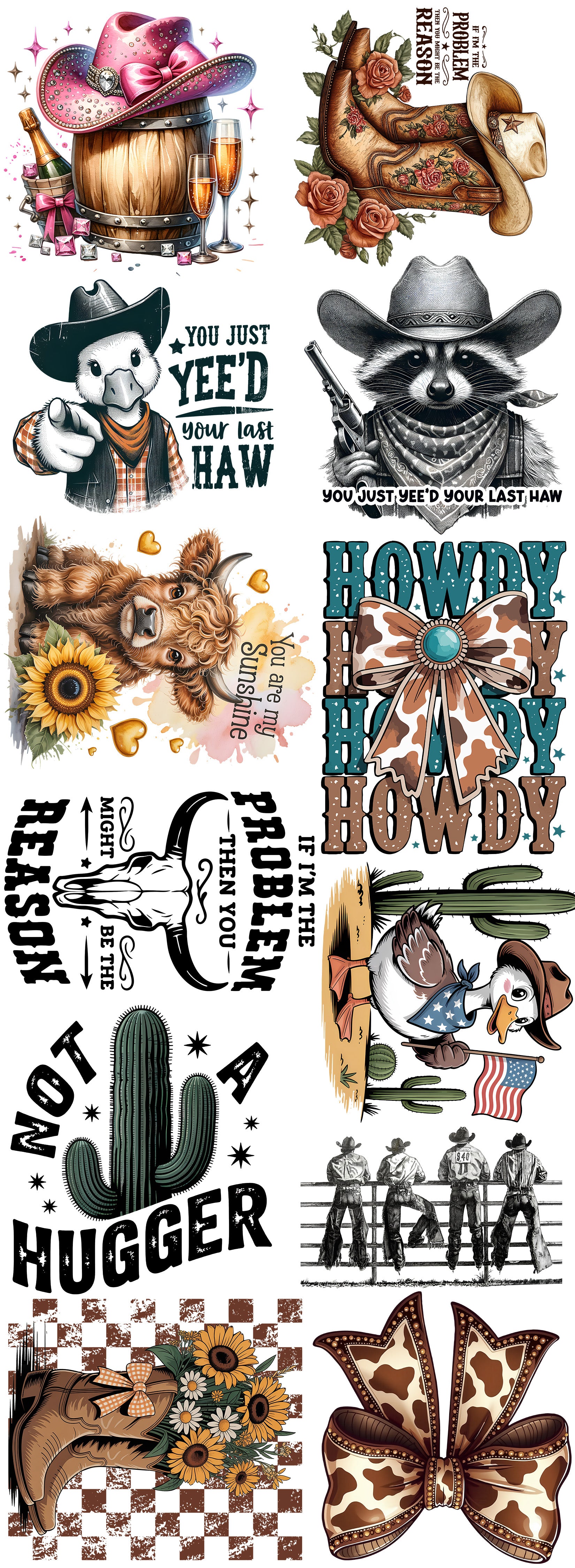 Classic Country Aesthetic: Capture the heart of the country with a beautiful Highland cow and sunflower design reading "You are my sunshine." This sheet also features a detailed steer skull stating "If I'm the problem then you might be the reason," an American flag-waving cowboy duck, and classic silhouettes of cowboys resting on a fence.