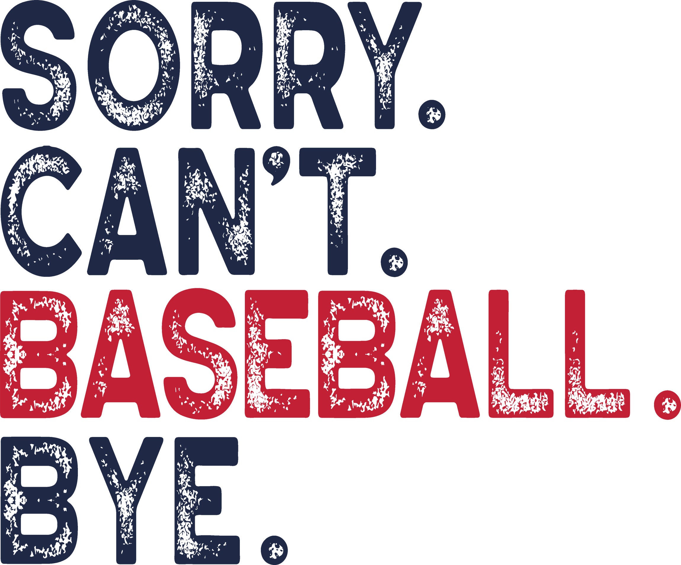 Calling all baseball moms, dads, and superfans! 🏟️ We all know that once season starts, your social calendar is officially booked. This "Sorry. Can’t. Baseball. Bye." transfer is the ultimate way to show off your love for the diamond with a side of humor. Featuring a classic navy and red palette with a cool distressed texture, it’s the perfect addition to your game-day wardrobe.