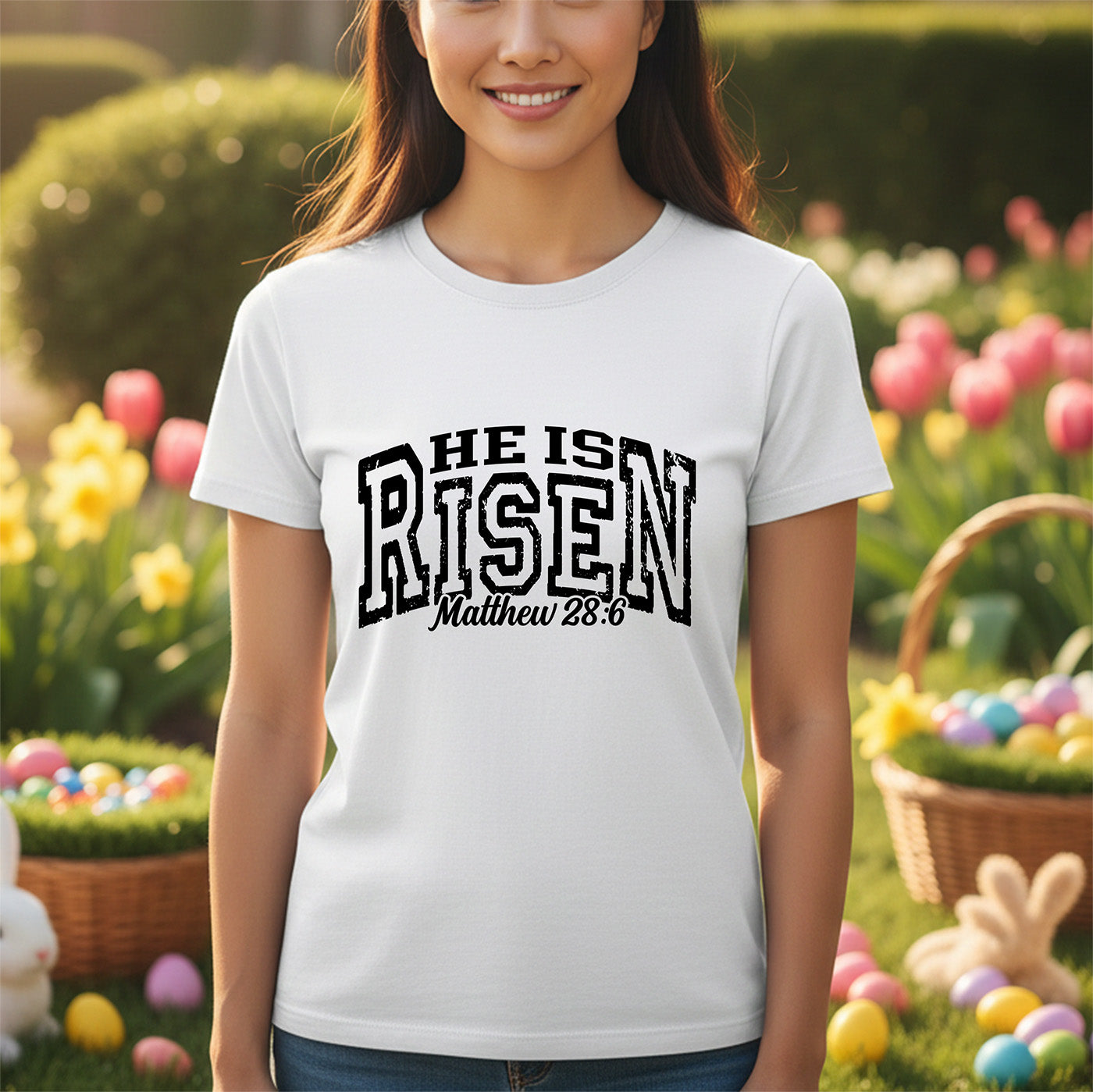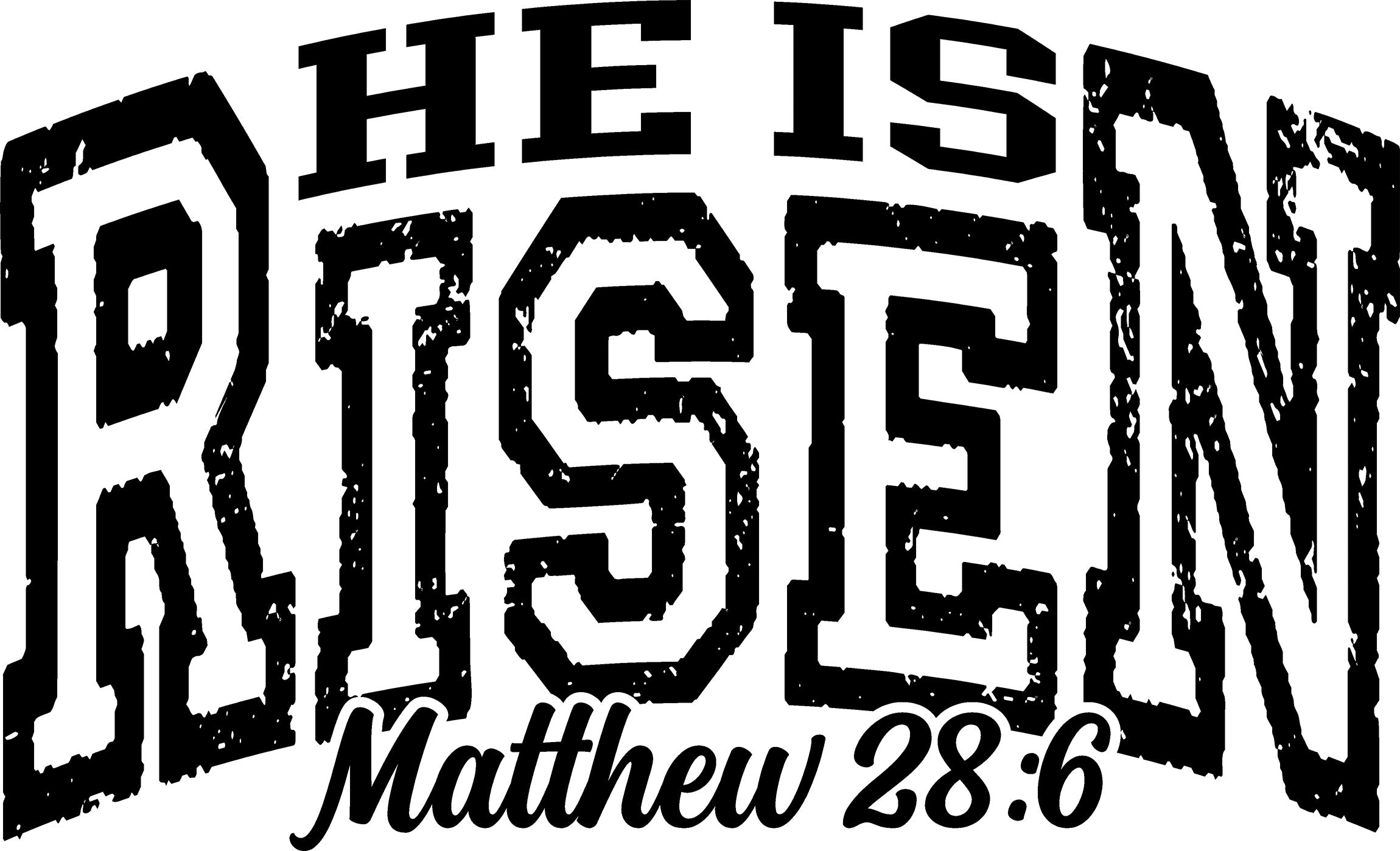 This striking transfer features the proclamation "HE IS RISEN" in massive, bold block letters with a rugged, distressed texture. Underneath, the scripture reference "Matthew 28:6" is written in a contrasting elegant script. Itβs a timeless message with a modern, grunge aesthetic that looks incredible on anything from Sunday best to casual hoodies! π€ποΈ