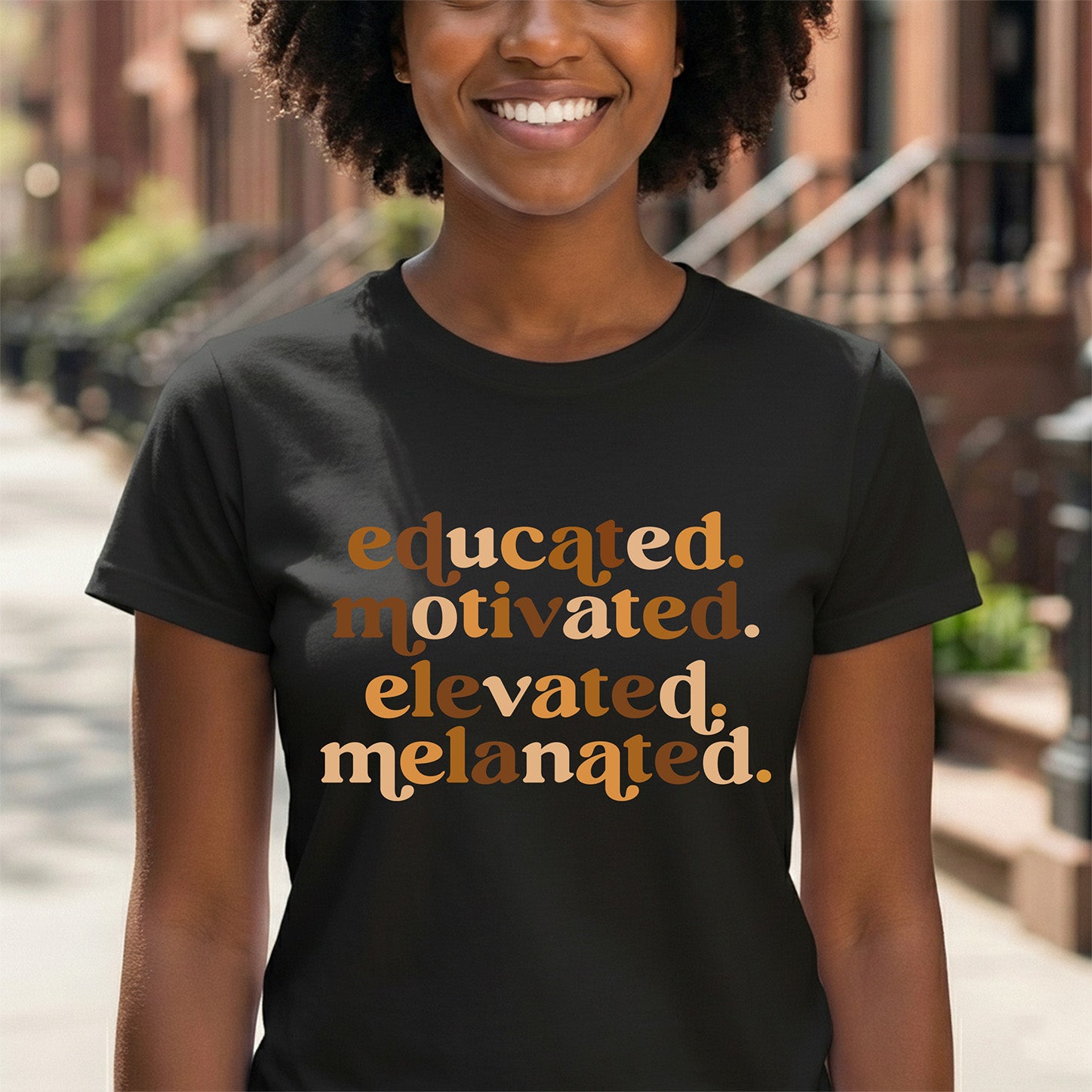 Wear your brilliance on your sleeve—literally! Our "Educated, Motivated, Elevated, Melanated" DTF transfer is a gorgeous celebration of identity and achievement. Featuring a stylish, wavy font in a beautiful palette of skin-tone nudes and warm browns, this design is the perfect way to create apparel that radiates confidence and pride.