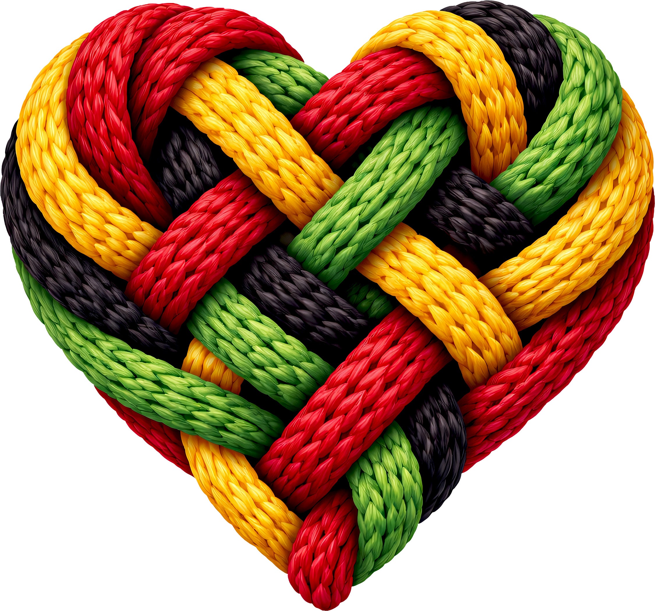 Add a touch of texture and a lot of heart to your next project! Our Braided Heritage Heart DTF transfer is a stunning, high-definition design that features vibrant cords of red, gold, green, and black interwoven into a perfect heart shape. This rich, 3D-effect design symbolizes the strength and unity of the community, making it an incredible choice for Black History Month gear or year-round statement pieces.