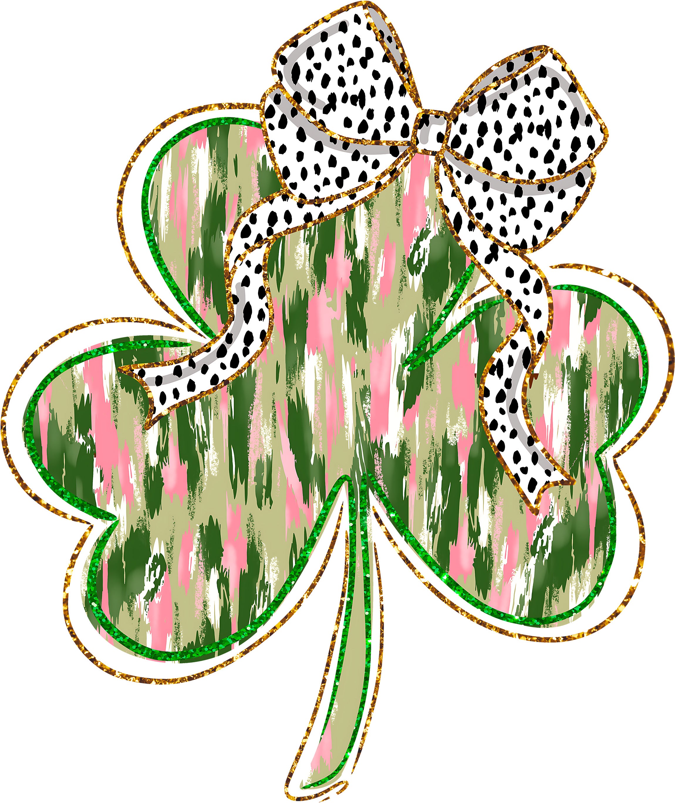 Get ready to get your glow on with this stunning, high-fashion Shamrock design! 🌈 Perfect for St. Paddy’s Day or any day you want to bring a little extra charm to your wardrobe, this transfer features a gorgeous mix of pink, sage, and forest green brushstrokes. Topped off with a chic dalmatian print bow and shimmering gold glitter outlines, it’s the ultimate "preppy-meets-lucky" vibe!
