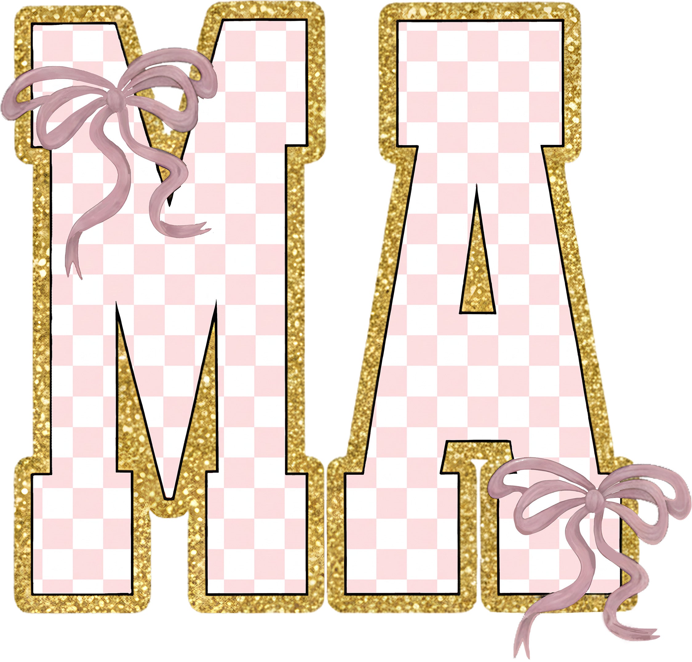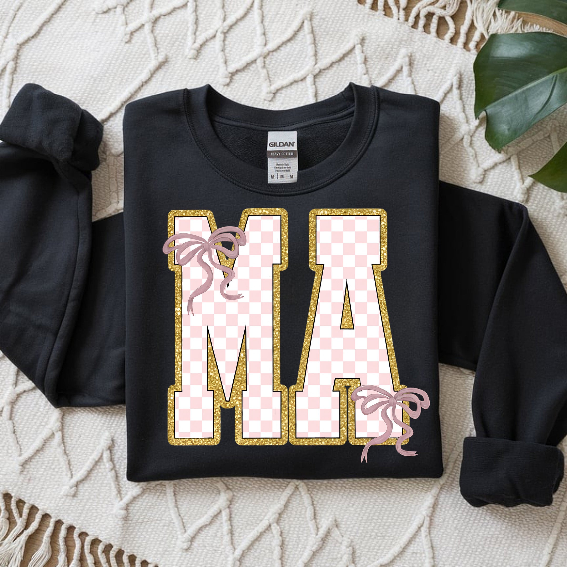 Looking for that perfect blend of sporty and sweet? This "MA" design features a chic pink-and-white checkered pattern, glamorous gold glitter outlines, and delicate dusty rose bows. Itβs the ideal choice for creating high-end boutique tees, cozy sweatshirts, or custom tote bags that any mama would love to rock!