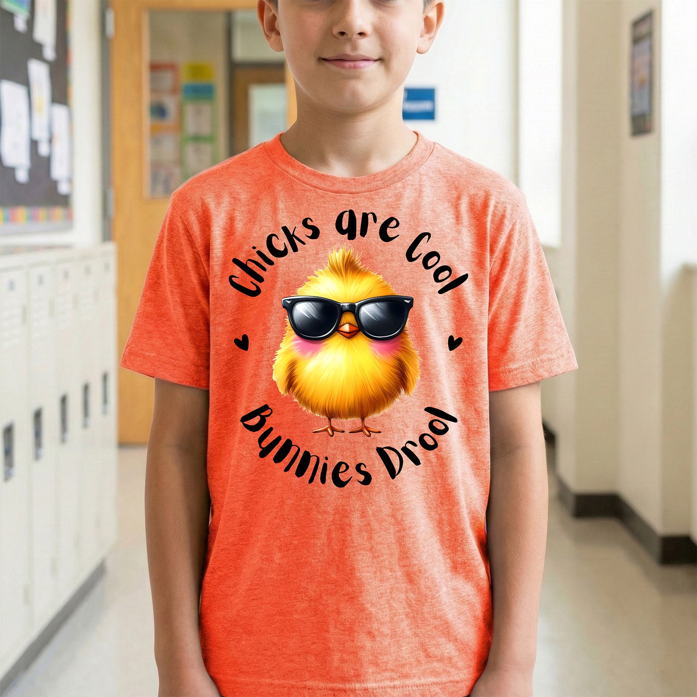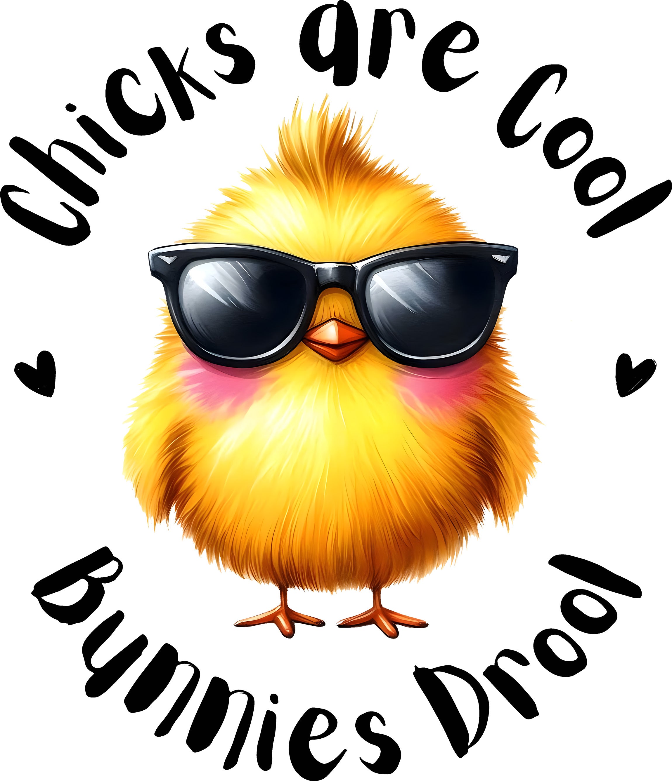 Featuring a super fluffy, ultra-cool yellow chick rocking a pair of black sunglasses, this transfer brings the attitude with the hilarious slogan: "Chicks are cool - Bunnies Drool." Itβs the perfect funny shirt for the "cool kids" at the egg hunt, or anyone who loves a little friendly competition during the holidays! πΆοΈπ°π«