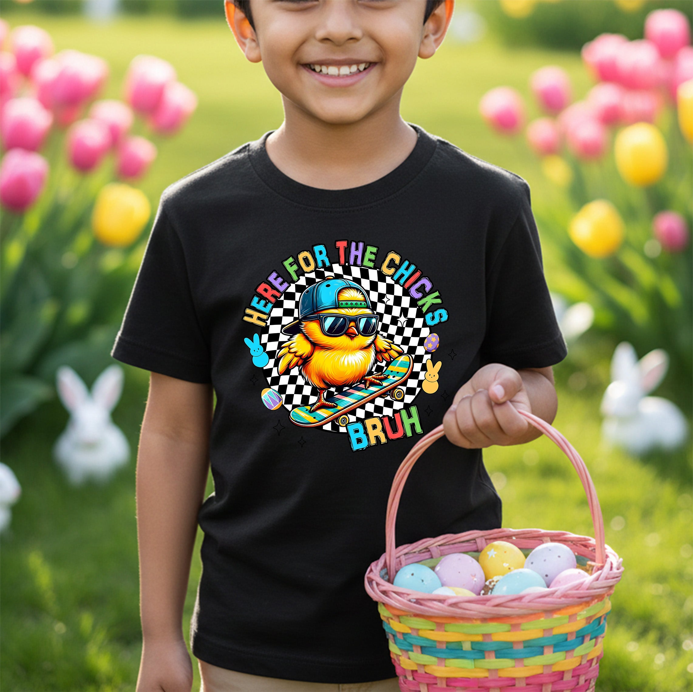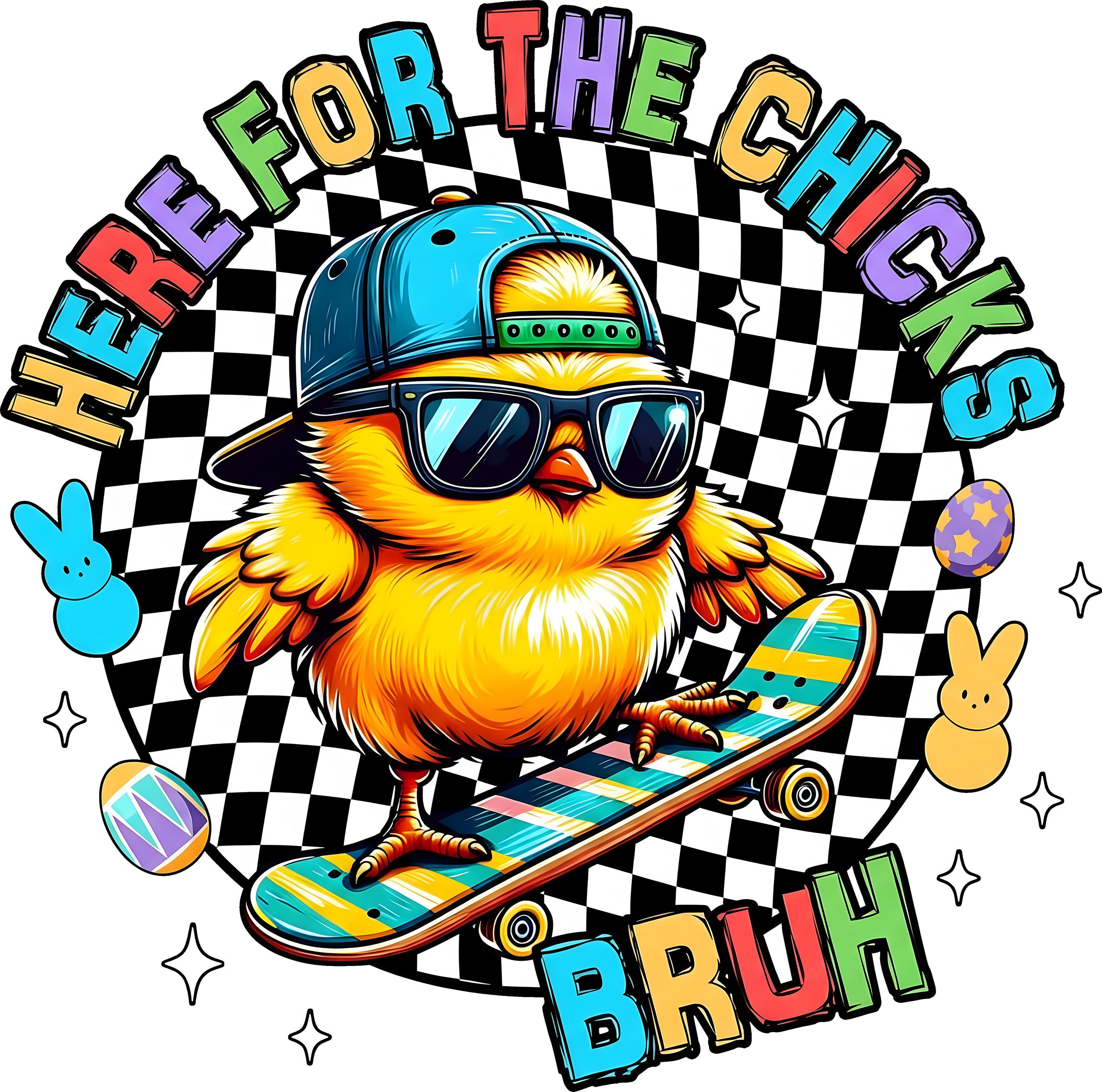 Featuring a fuzzy yellow chick decking out in a backwards cap and sunglasses, shredding on a skateboard, this transfer is all about style. With a retro checkerboard background, colorful Easter eggs, and the hilarious phrase "HERE FOR THE CHICKS BRUH," it's the perfect choice for boys, skaters, or anyone with a great sense of humor! ๐งข๐ฅ