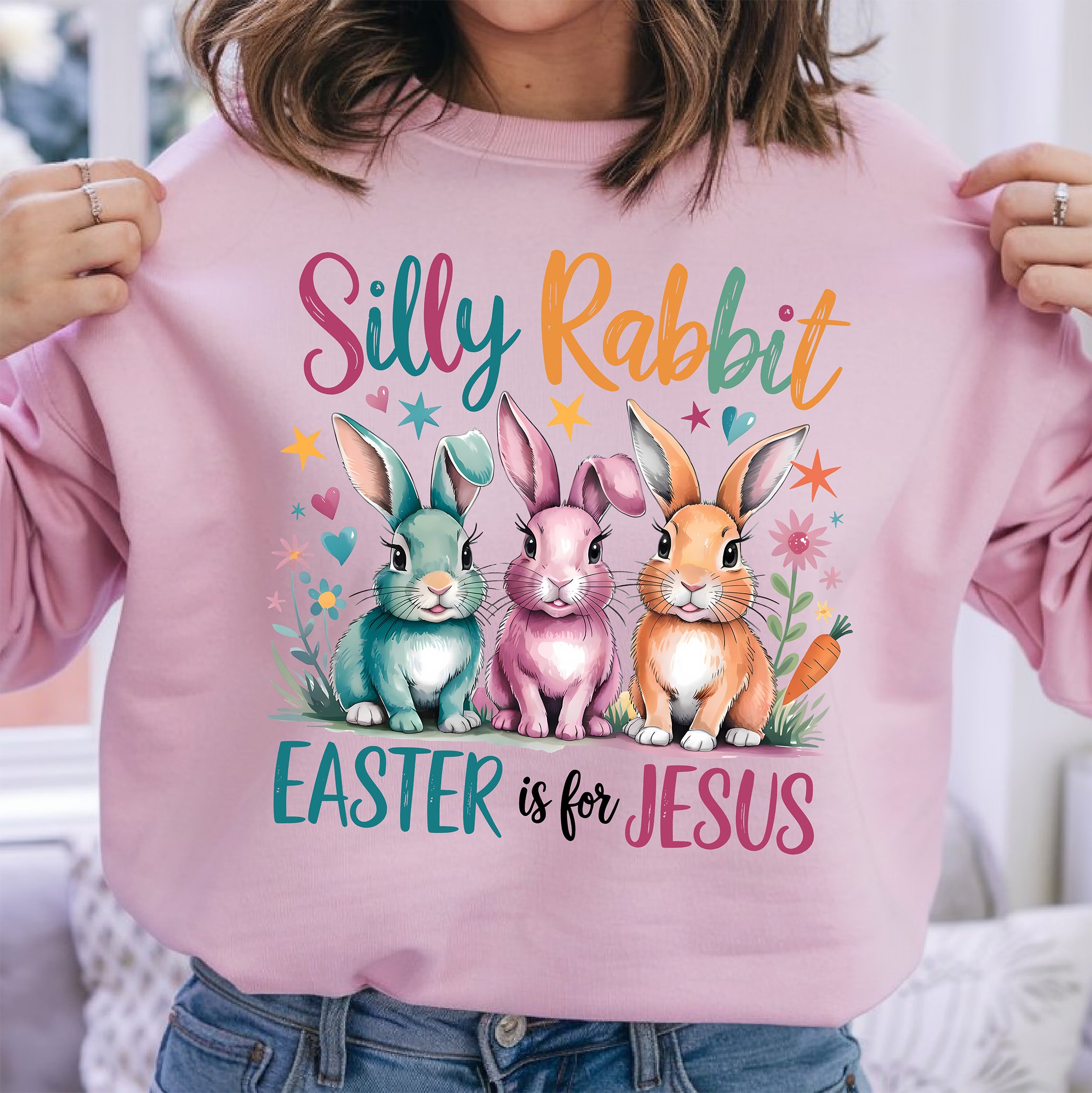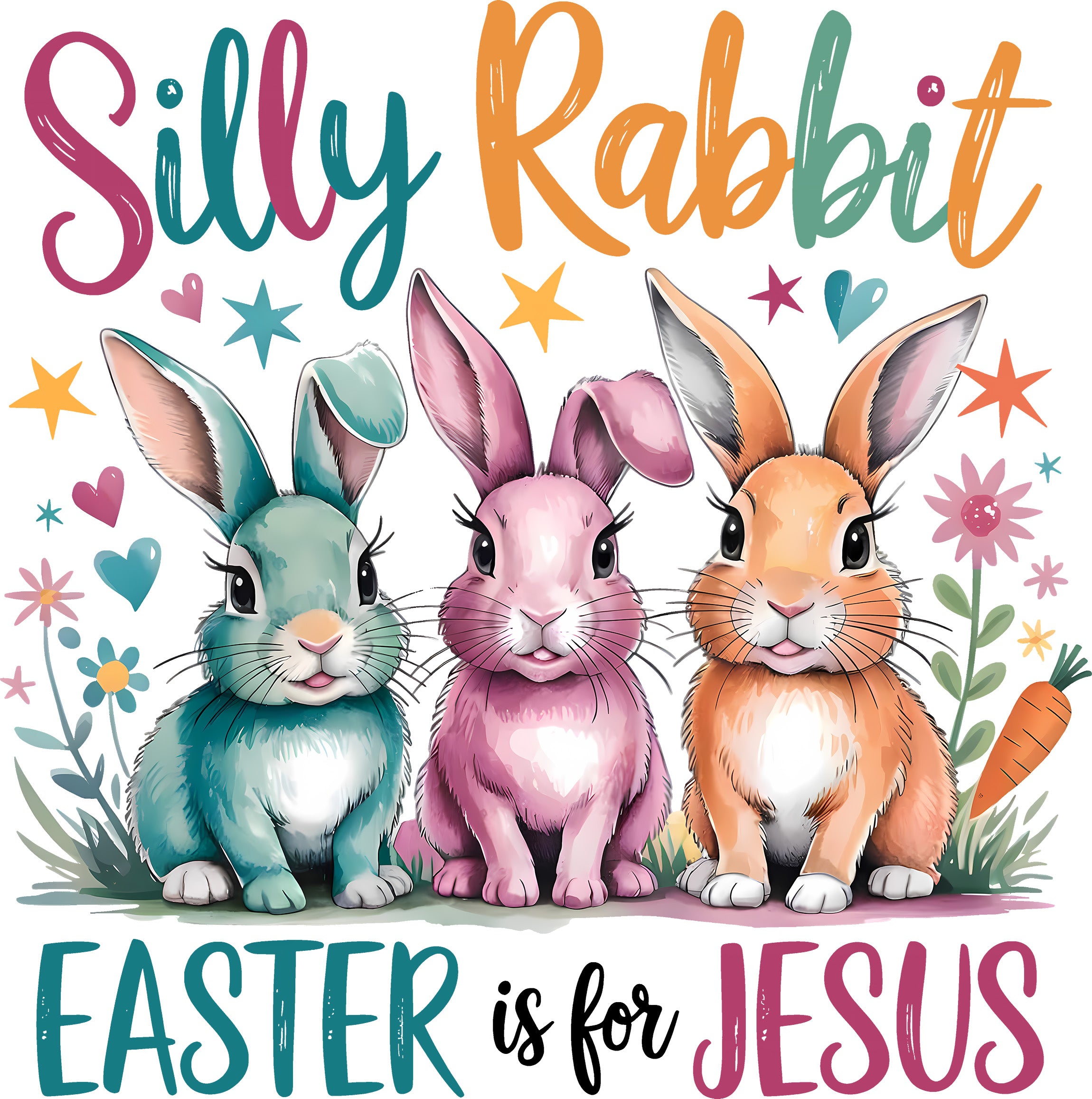Featuring a colorful trio of bunnies (in adorable teal, pink, and orange) surrounded by whimsical stars, hearts, and flowers, this transfer brings a smile to everyone's face. The catchy phrase "Silly Rabbit, EASTER is for JESUS" puts a faith-filled twist on a classic slogan, making it perfect for Sunday School, church egg hunts, or just a heartwarming family outfit! π₯π