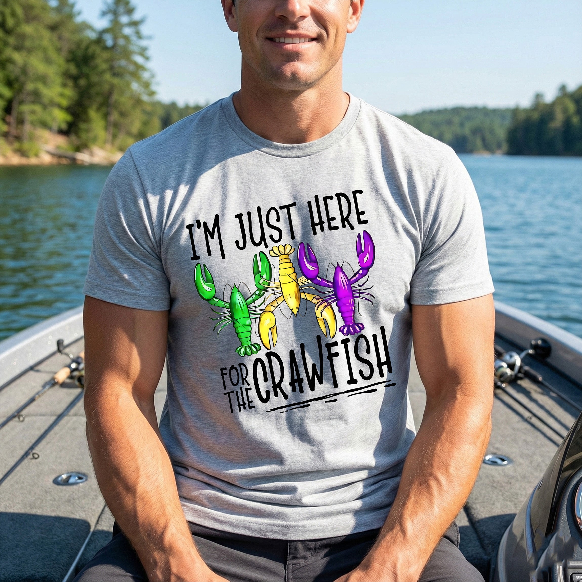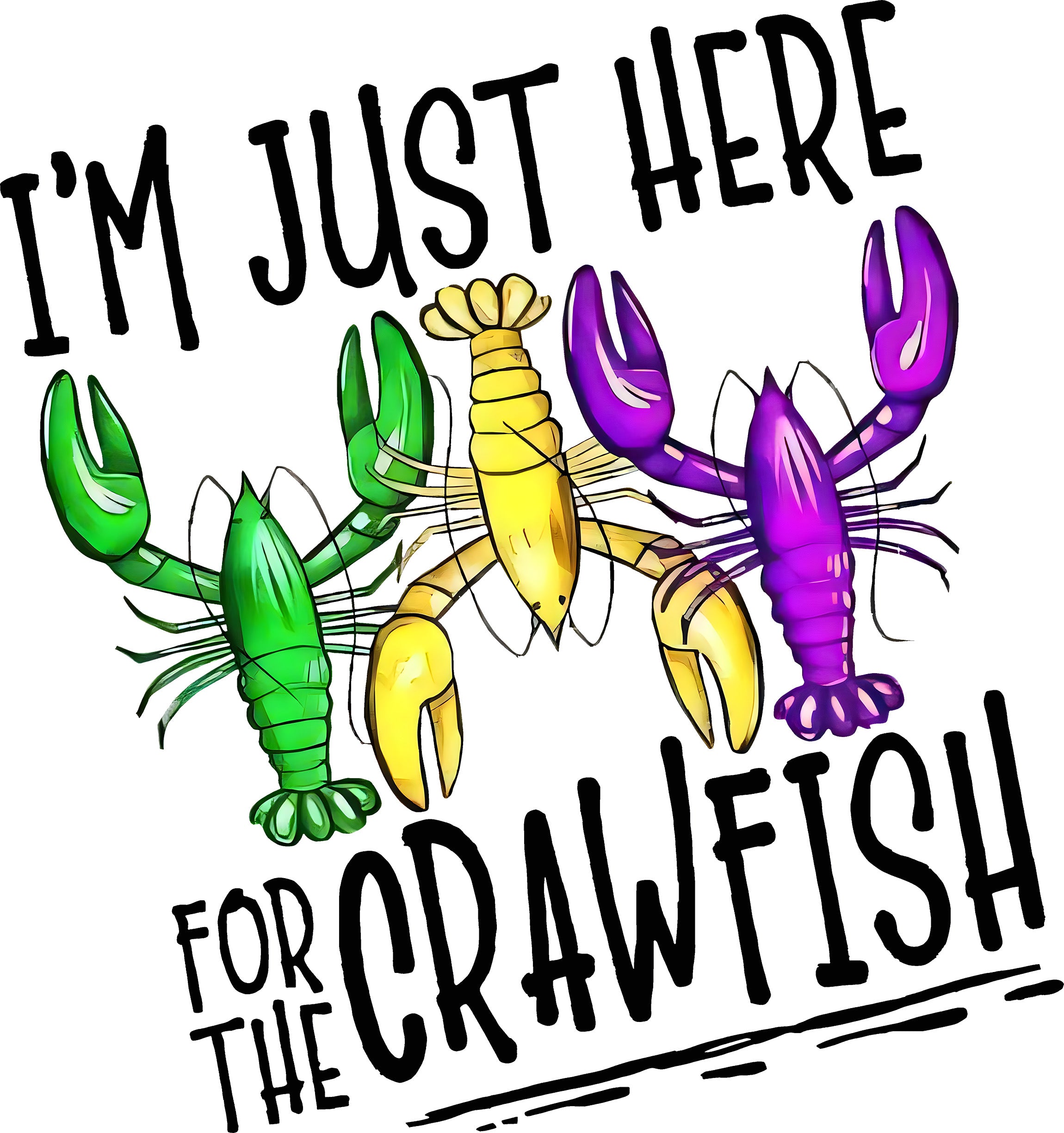 Featuring the phrase "I'M JUST HERE FOR THE CRAWFISH" in a fun, hand-lettered font, this transfer showcases three crawfish decked out in traditional Mardi Gras colors: vibrant green, gold, and purple! Itโs the perfect shirt for backyard boils, festival food runs, or just showing off your priority list this season.