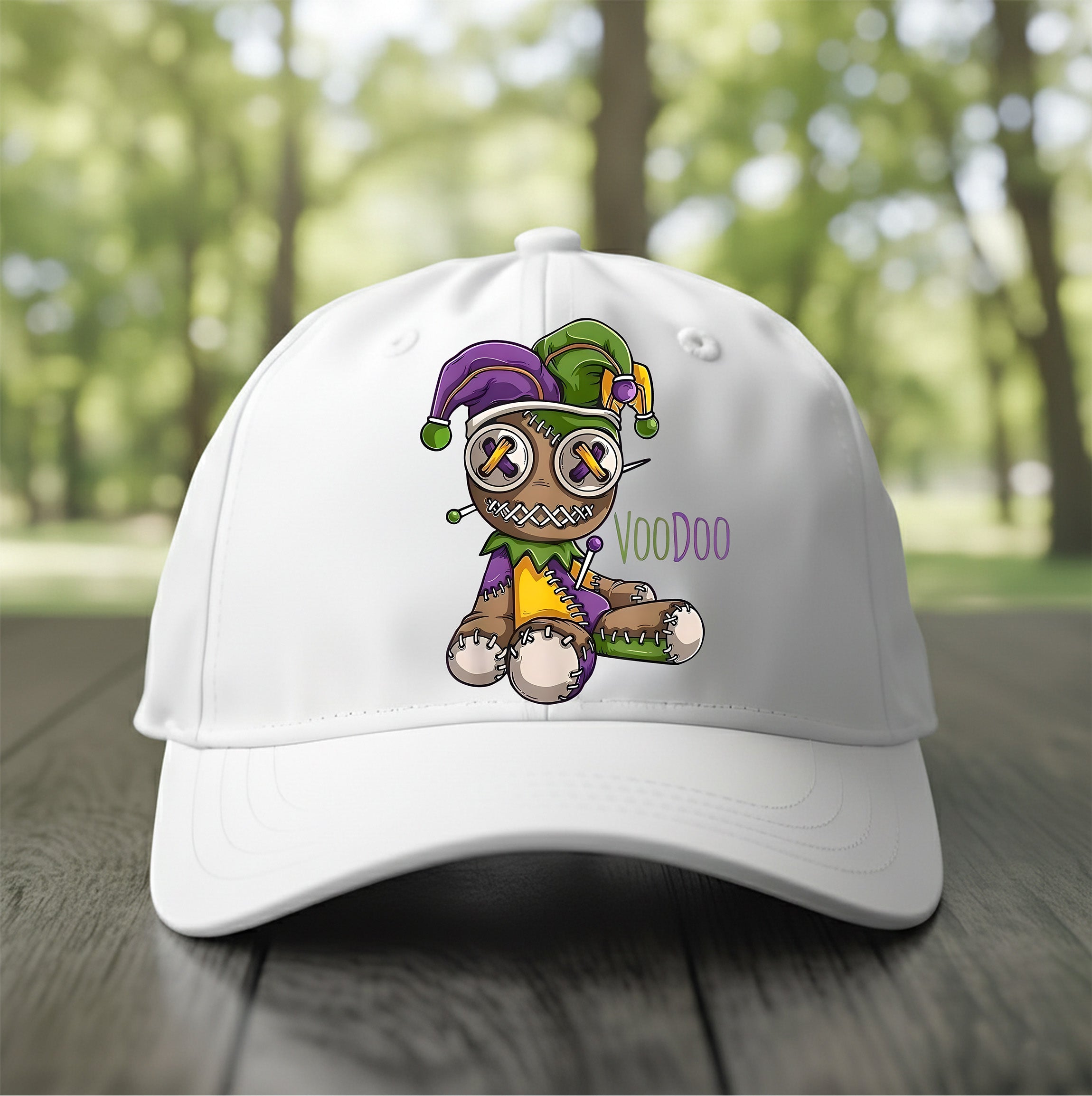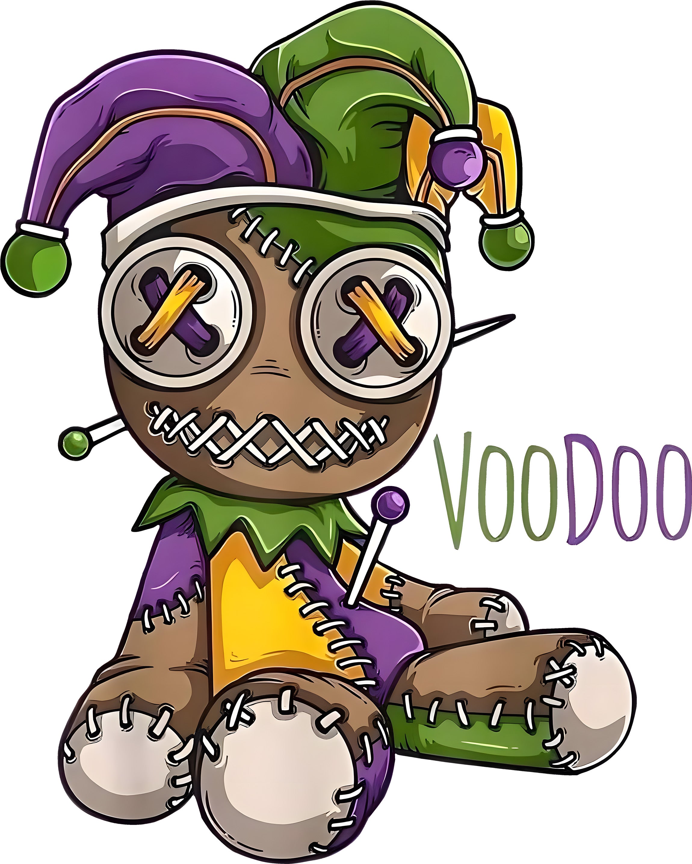 Add some New Orleans mystery to your custom gear with our festive Voodoo Doll! Featuring classic purple, green, and gold accents, button eyes, and a whimsical jester cap, this design is the perfect mix of spooky and celebratory. It’s a must-have for parade season or anyone who loves a bit of Bayou magic.