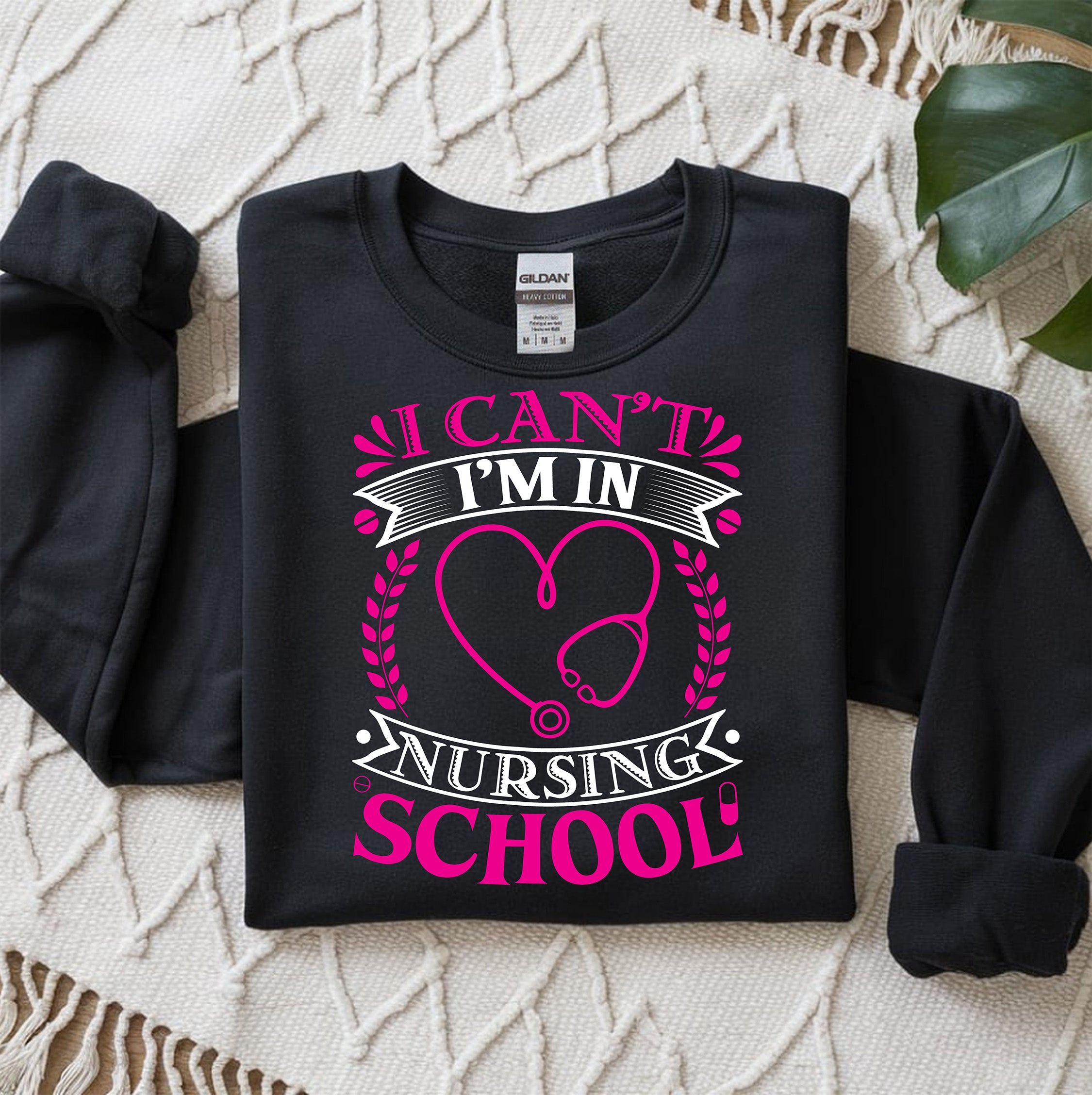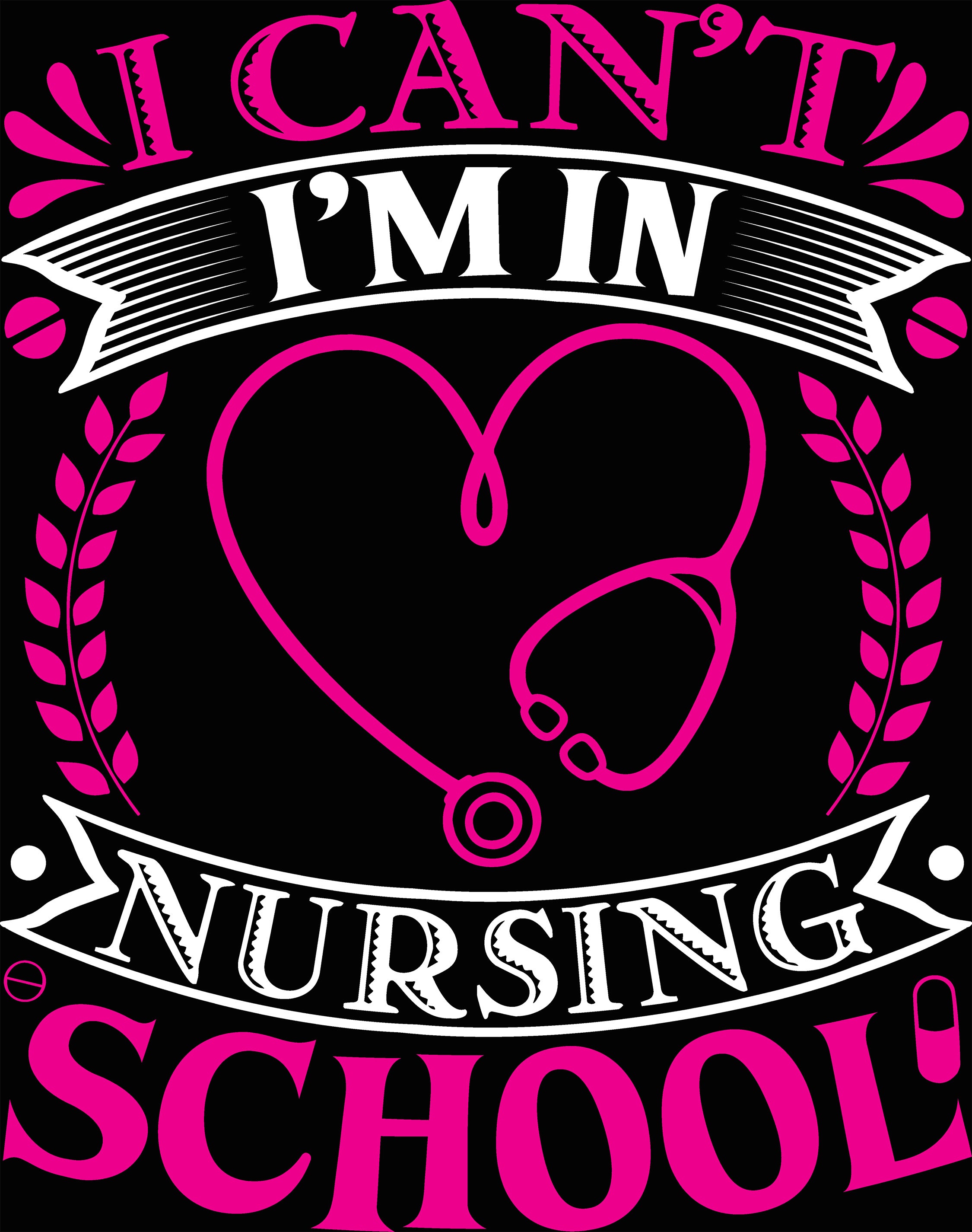 This eye-catching transfer features the classic student motto "I CAN'T I'M IN NURSING SCHOOL" on vintage-style banners. At the center is a large, hot pink heart formed by a stethoscope, symbolizing the love you have for your future career. Framed by pink laurel wreaths and cute little pill capsules, itโs a bold statement piece that looks amazing on black, grey, or white tees! ๐๐