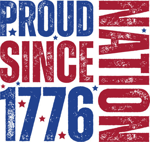 Celebrate American history with a design that makes a big statement! Our Proud Nation Since 1776 transfer features a unique and trendy typographic layout that sets it apart from standard flag shirts. The left side stacks the words "PROUD" (in navy blue), "SINCE" (in red), and "1776" (in navy blue) for a bold block-text look.