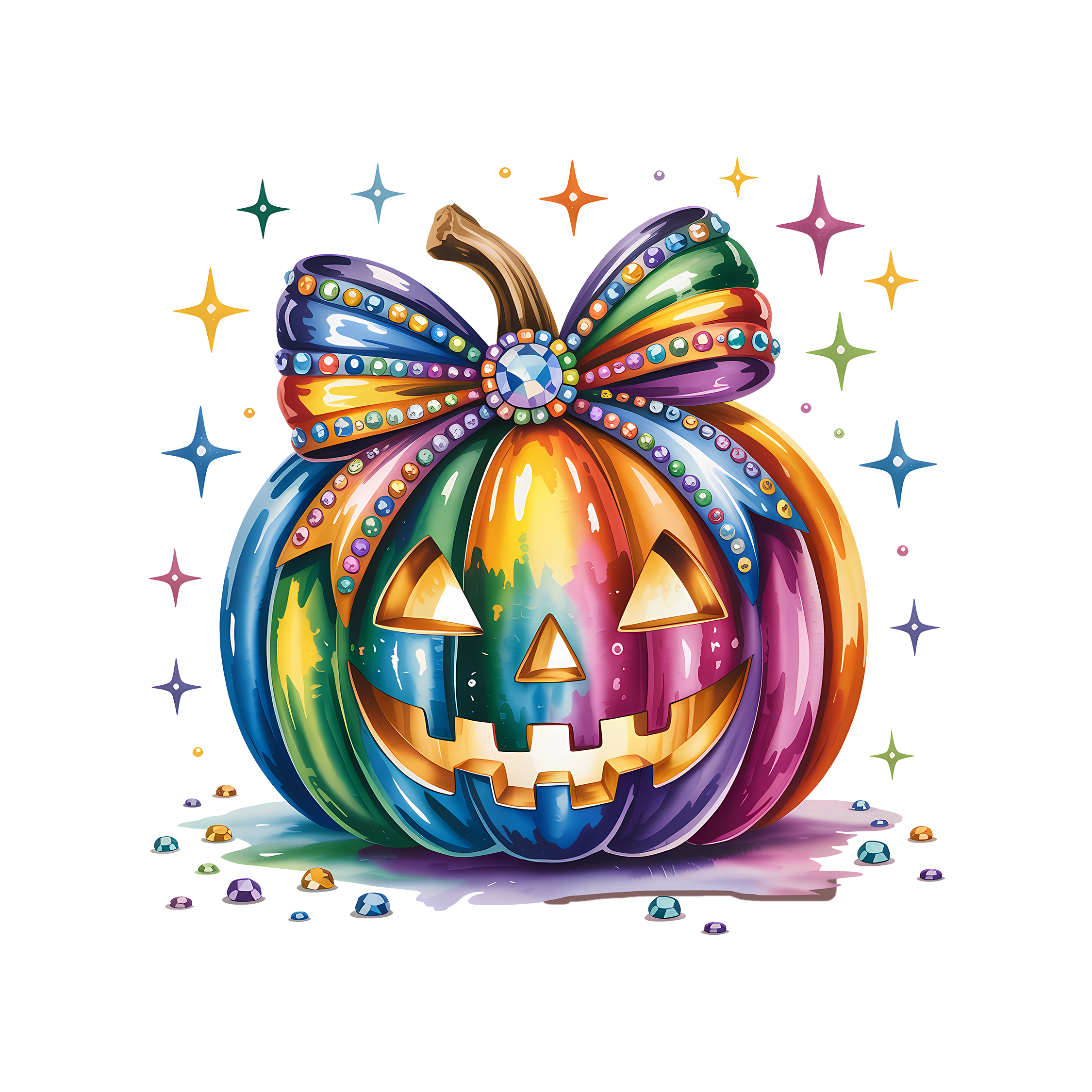 Who says spooky season can't be spectacular? Outshine the entire pumpkin patch with our absolutely stunning Rainbow Gemstone Pumpkin DTF Heat Transfer! This design is for everyone who prefers glam over gore and sparkle over scares, turning a classic autumn favorite into a fabulous fashion statement.