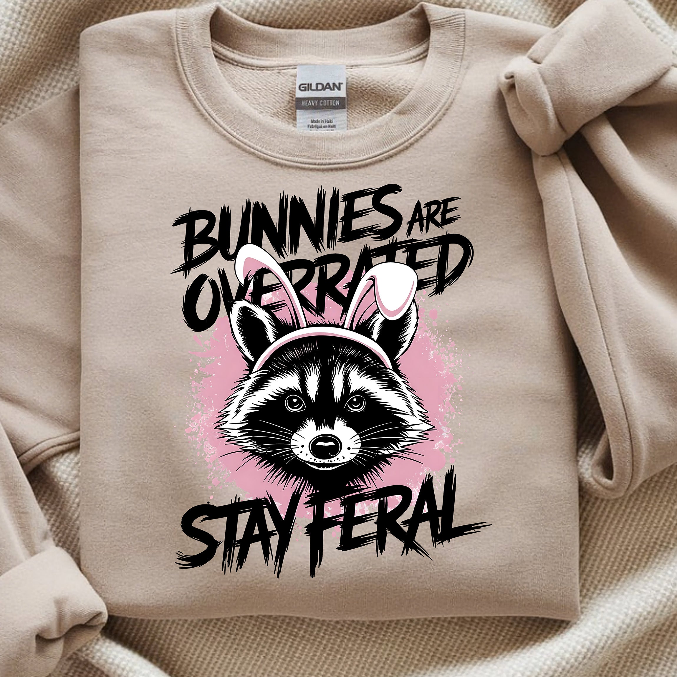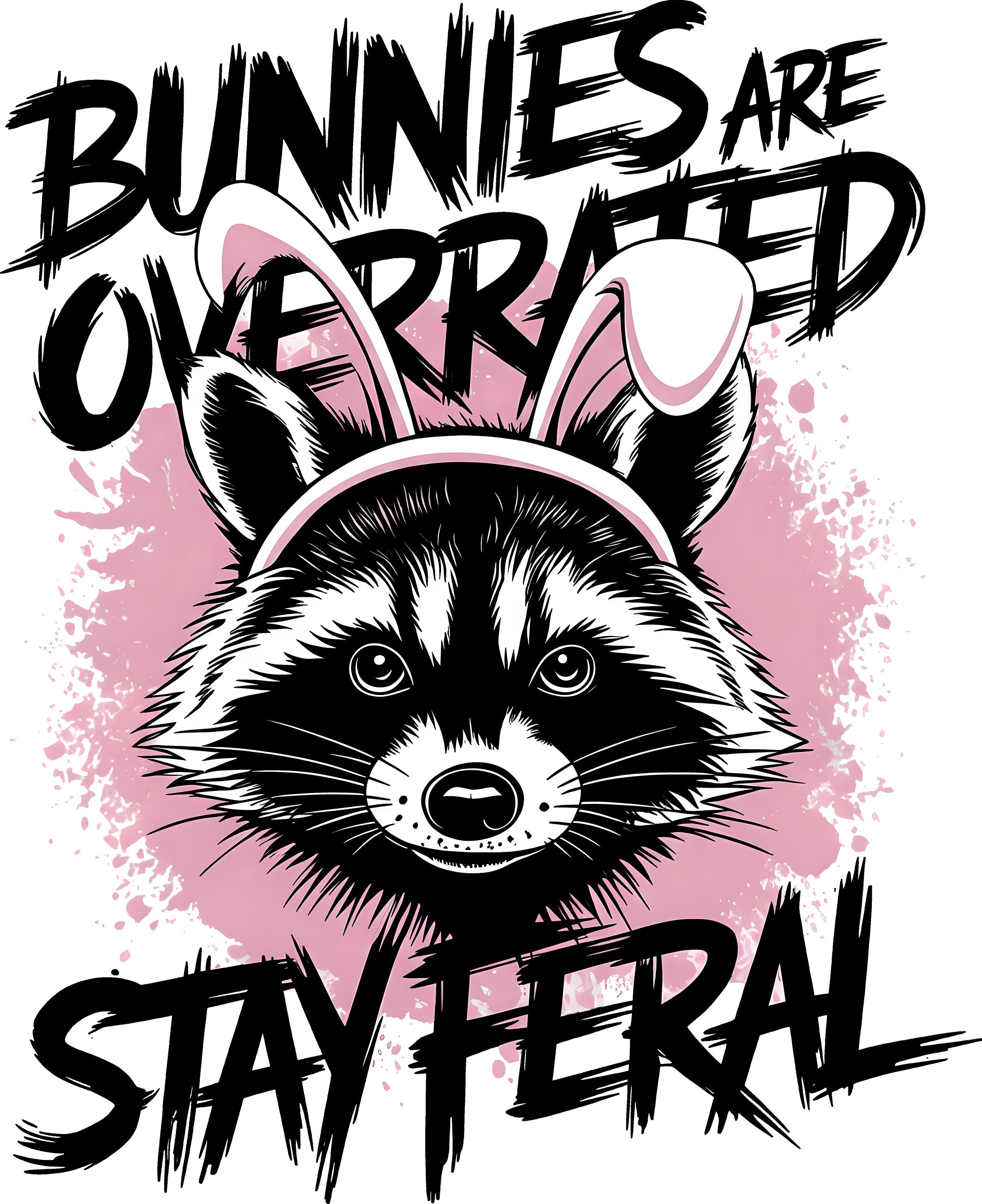 This hilarious transfer features a mischievous raccoon disguised in pink bunny ears, surrounded by edgy, distressed text that reads: "BUNNIES ARE OVERRATED β STAY FERAL." Set against a grunge pink splash, itβs the perfect anti-Easter look for the wild ones, the rebels, and anyone who prefers a little attitude with their chocolate! π«πΈ