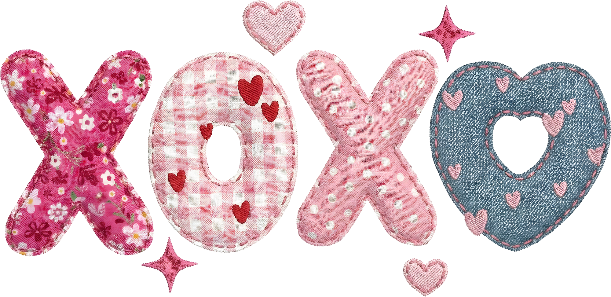 This design is bursting with personality, featuring a sweet "scrapbook" style lineup. You get a floral pink "X", a classic gingham "O" topped with mini hearts, a polka-dot "X", and a trendy denim-textured "O" with embroidered details. Surrounded by stitched hearts and sparkles, it’s a whimsical, crafty dream come true.