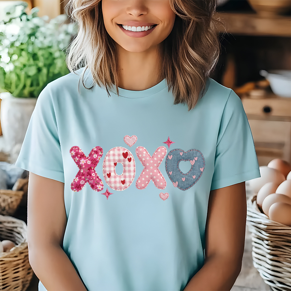 Why choose just one pattern when you can have them all? Our Gingham & Denim "XOXO" transfer is a mixed-media masterpiece that brings the charm of a handmade quilt straight to your favorite tee!