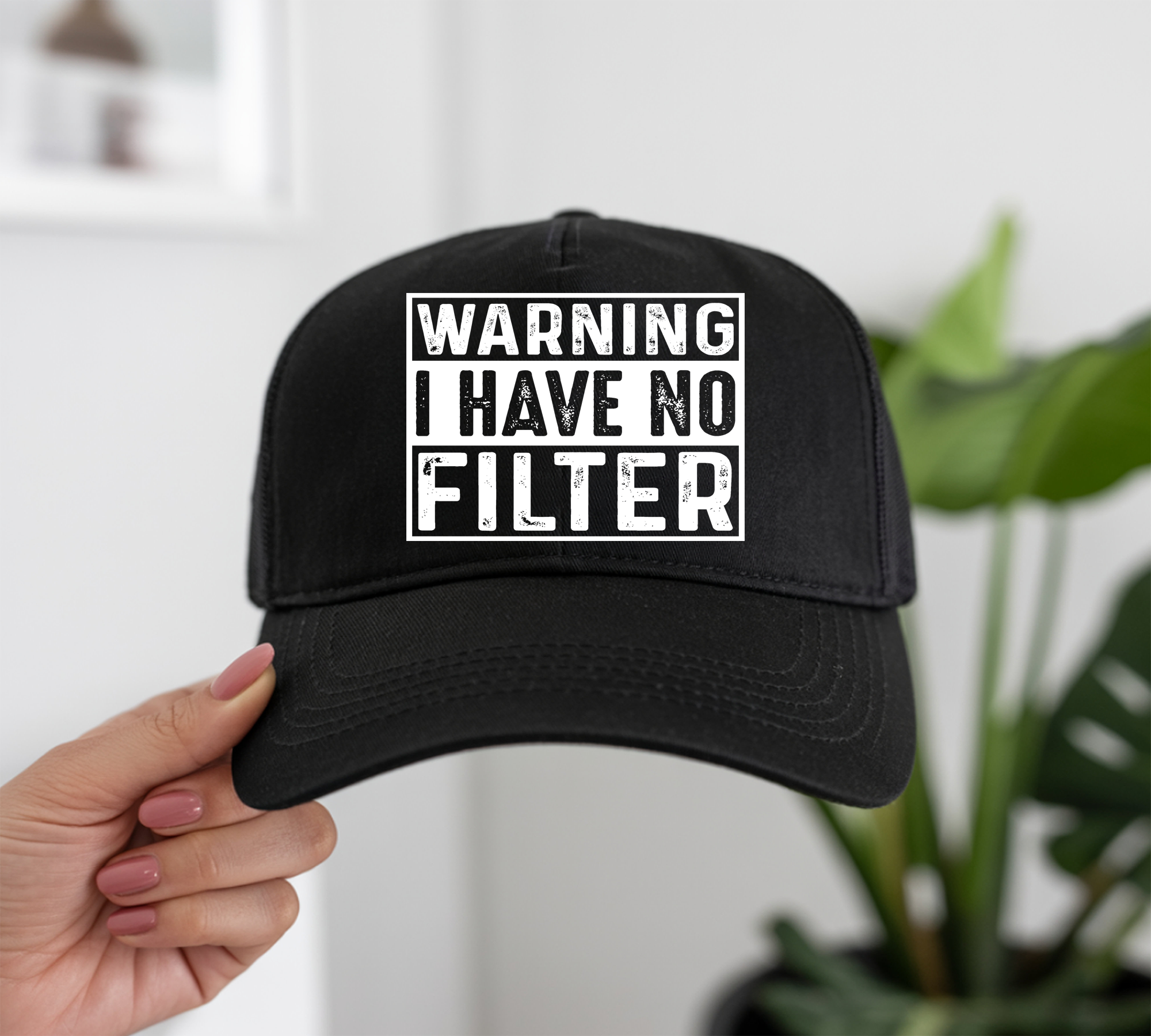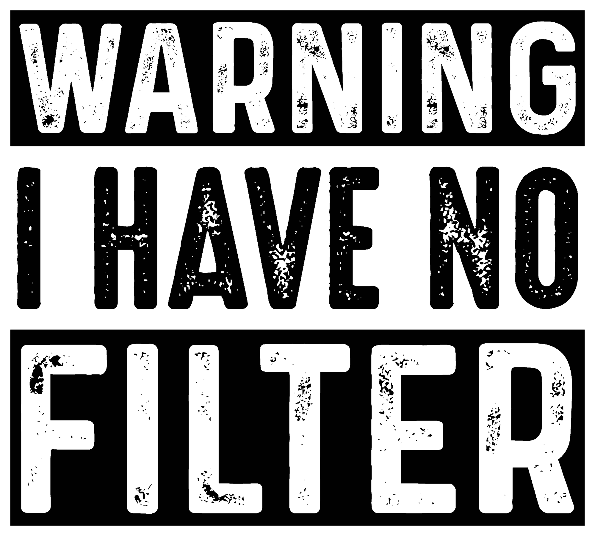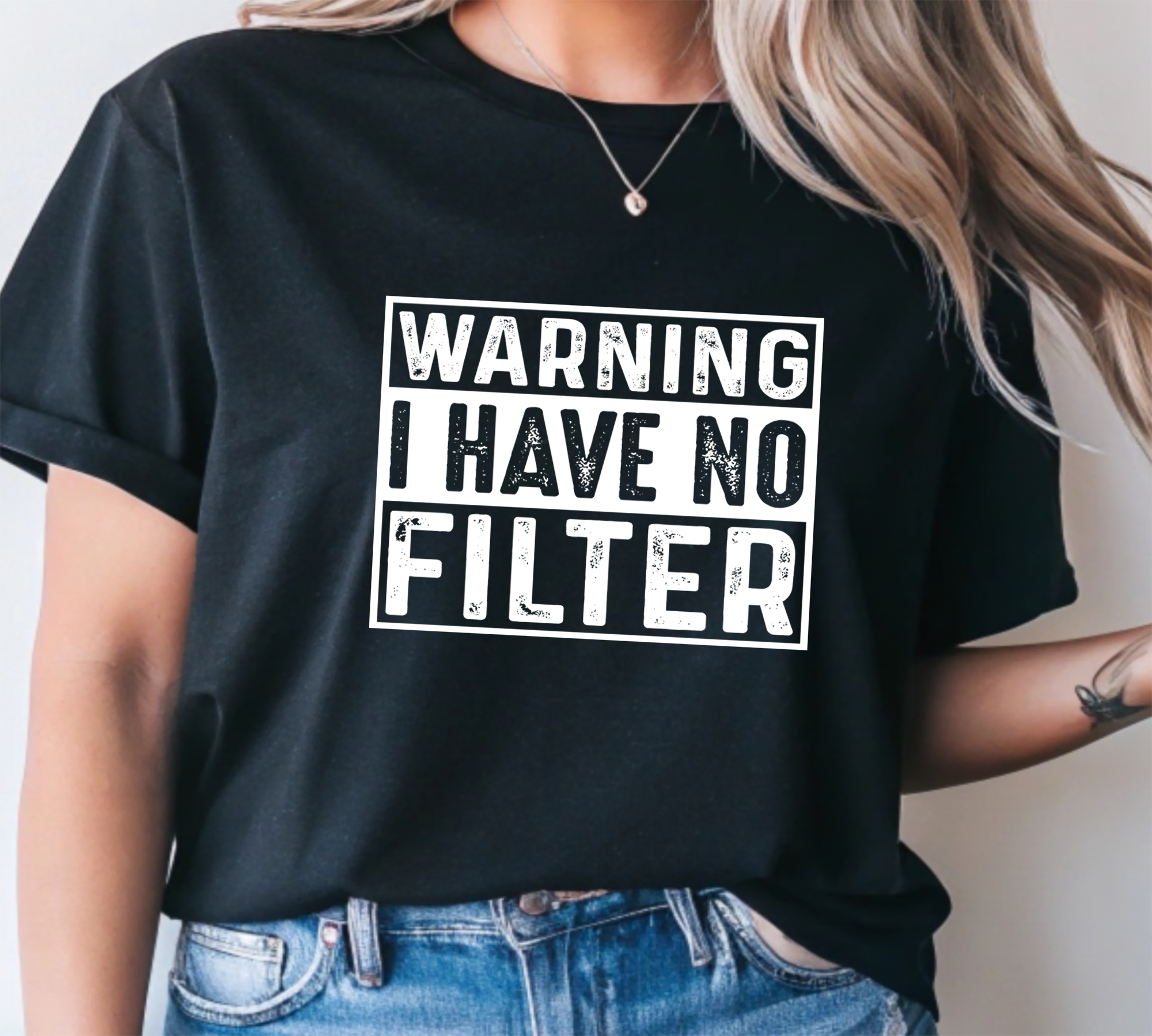 This design mimics a caution sign with a cool, vintage twist. It features the phrase "WARNING I HAVE NO FILTER" in large, impactful block letters with a trendy distressed/grunge texture. It is the perfect graphic for that friend who "tells it like it is," or for those days when you just want to keep it real.