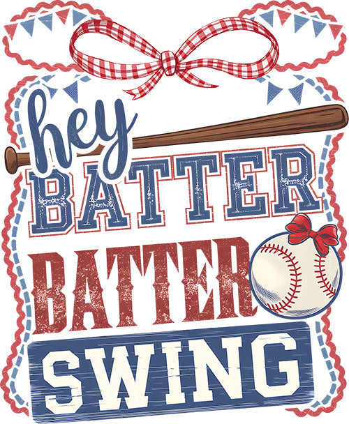 The typography is a fun mix of styles: "hey" in a casual navy script, followed by "BATTER" in distressed blue outline and red block letters, and finally "SWING" in bold white text on a navy blue sign. Complete with a wooden bat and a baseball sporting its own cute red bow, this design is a home run for moms, aunts, and sisters who love a classic Americana look!