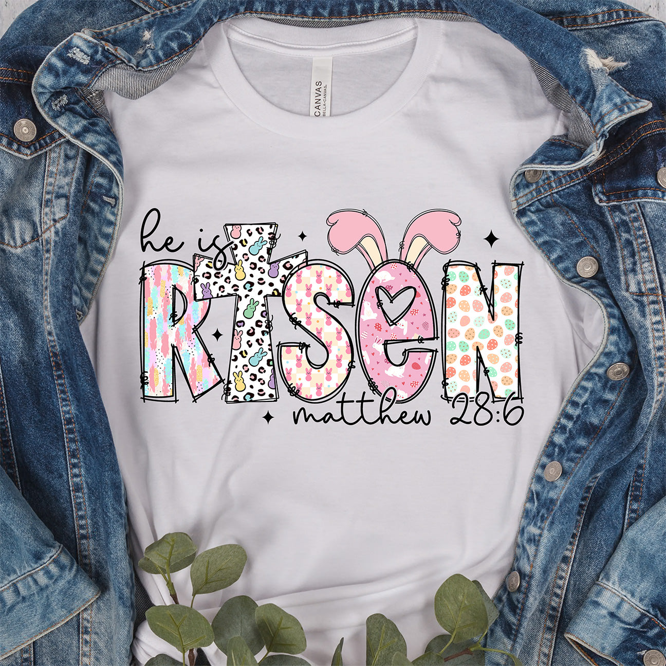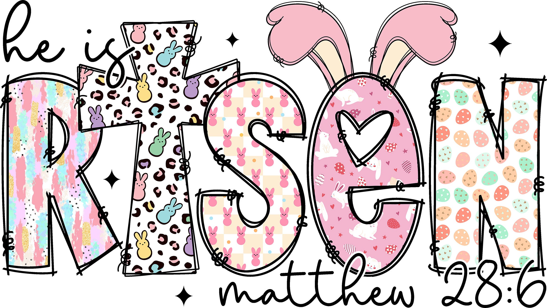 This trendy "doodle style" transfer features the phrase "He is RISEN" in big, bold block letters, each filled with a unique and festive pattern.