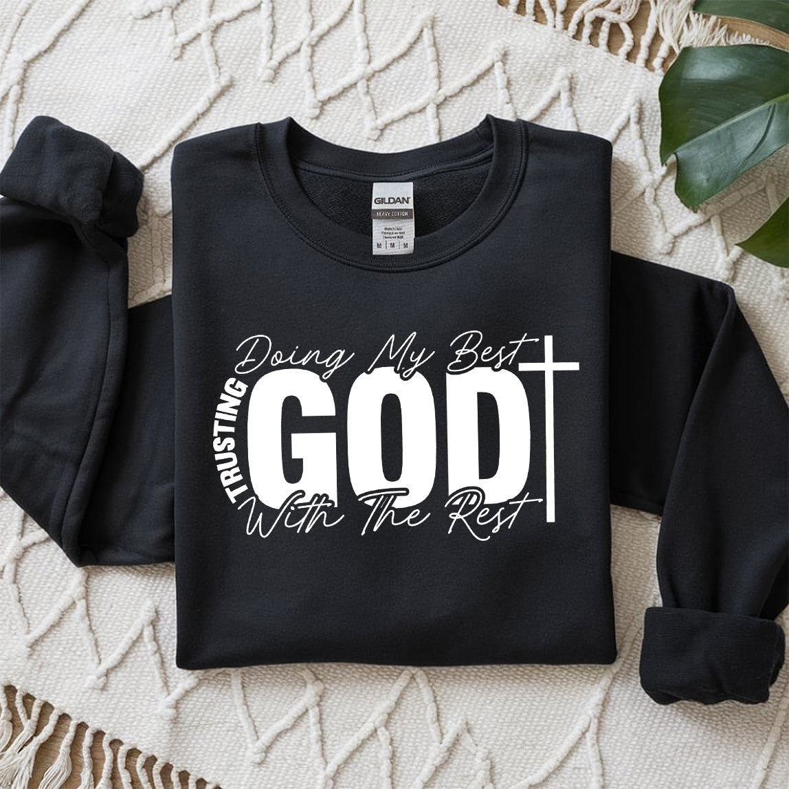 At the center, a bold, block-letter "GOD" stands strong, anchored by a simple cross to the right. With the word "TRUSTING" curving gracefully along the side, this design is a powerful declaration of faith that looks amazing on sweatshirts, tees, and hoodies. It represents the perfect balance of working hard and letting go!