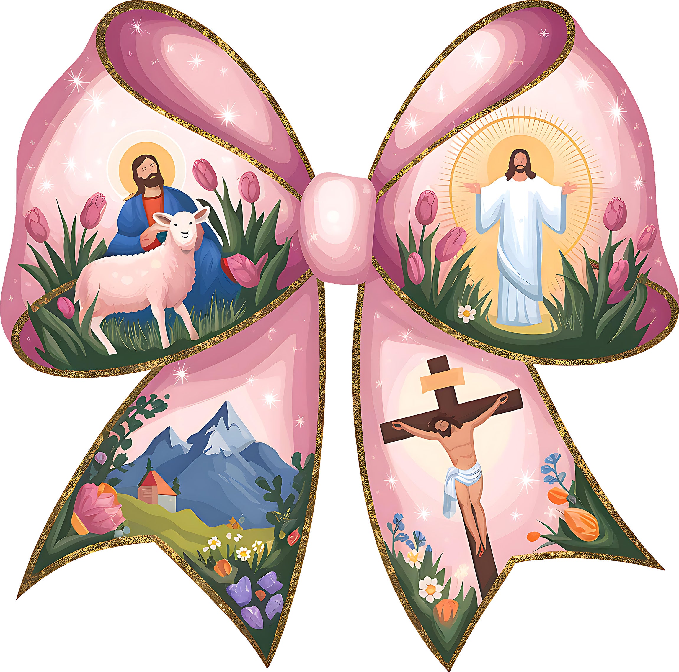 Celebrate the true meaning of the season with a touch of preppy perfection! 🌷 Our Easter Story Coquette Bow DTF transfer is a breathtaking blend of faith and modern style. This stunning design features a large, shimmering pink bow divided into four beautiful scenes: Jesus as the Good Shepherd, His glorious Resurrection, a peaceful mountain landscape, and the powerful sacrifice on the Cross.