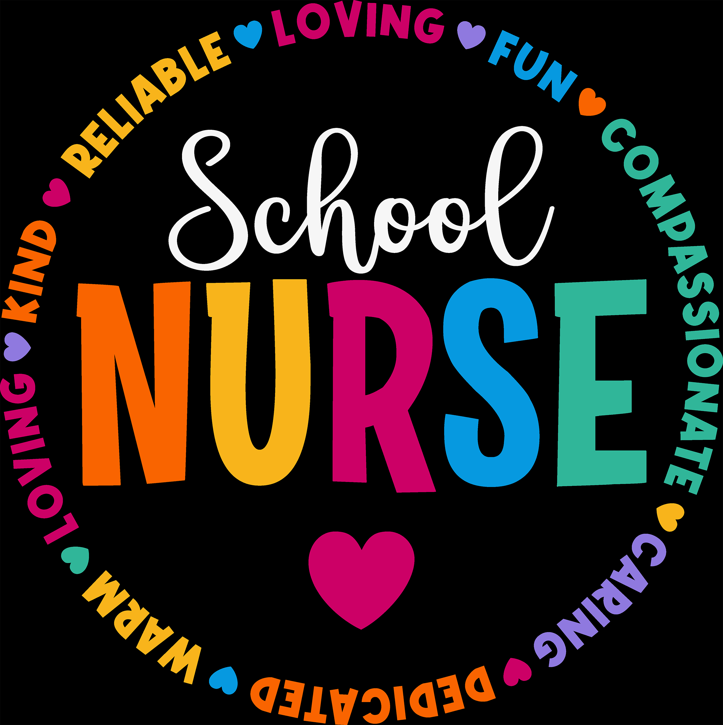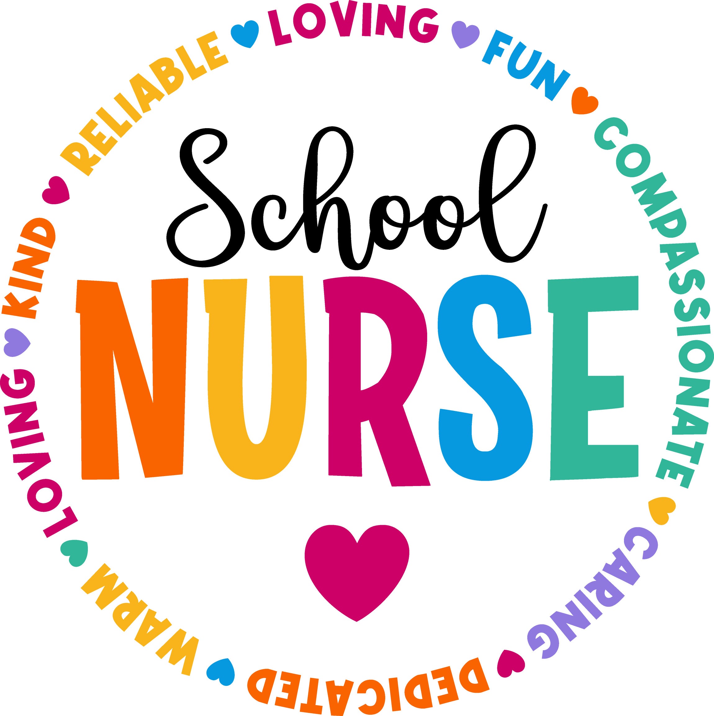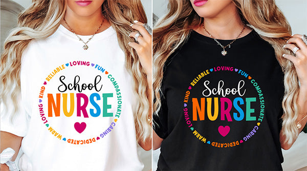 Celebrate the superheroes of the hallway with our vibrant "School Nurse" DTF transfer! This cheerful design features "NURSE" in bold, rainbow colors, surrounded by a heartwarming circle of traits that define our favorite medical pros: Kind, Reliable, Loving, Fun, Compassionate, Caring, Dedicated, and Warm.