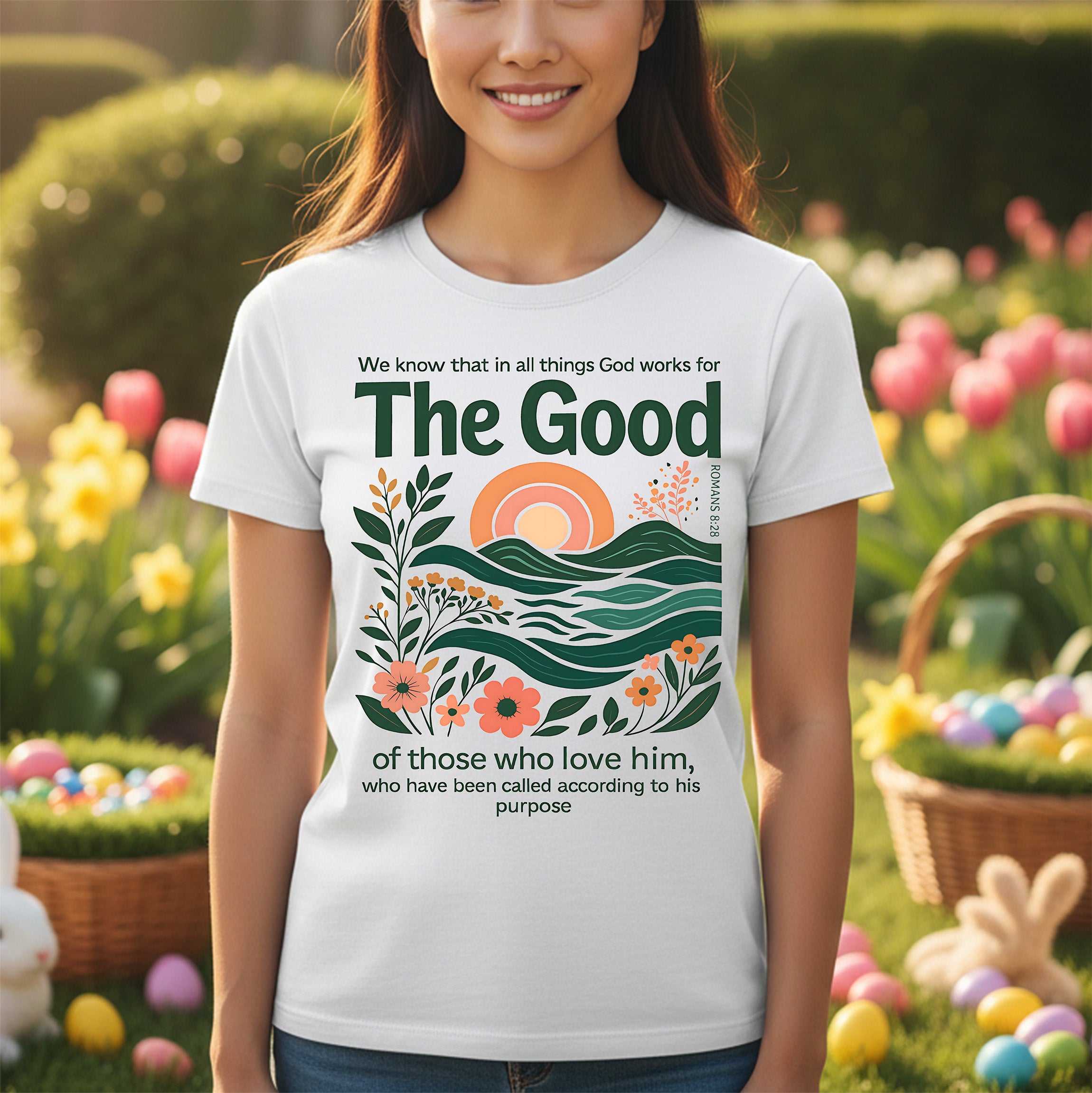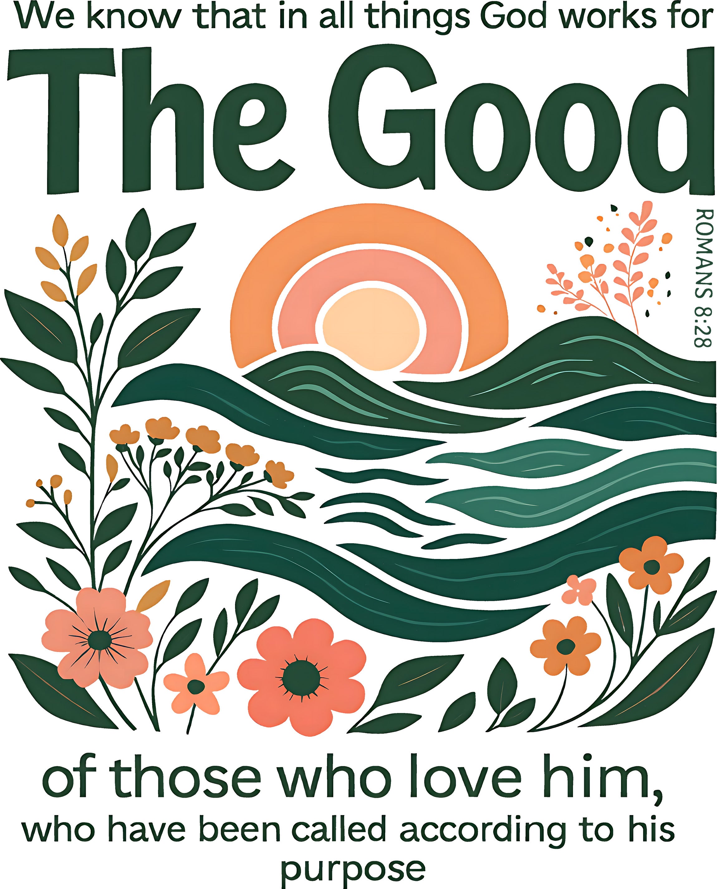 This artistic transfer features the powerful scripture from Romans 8:28: "We know that in all things God works for The Good of those who love him, who have been called according to his purpose." The text is artfully arranged around a gorgeous scene of stylized rolling green hills and a warm, retro peach sunset. Framed by lovely blooming flowers and leafy branches in sage and terracotta tones, itβs a calming and uplifting addition to any wardrobe! πΈπ