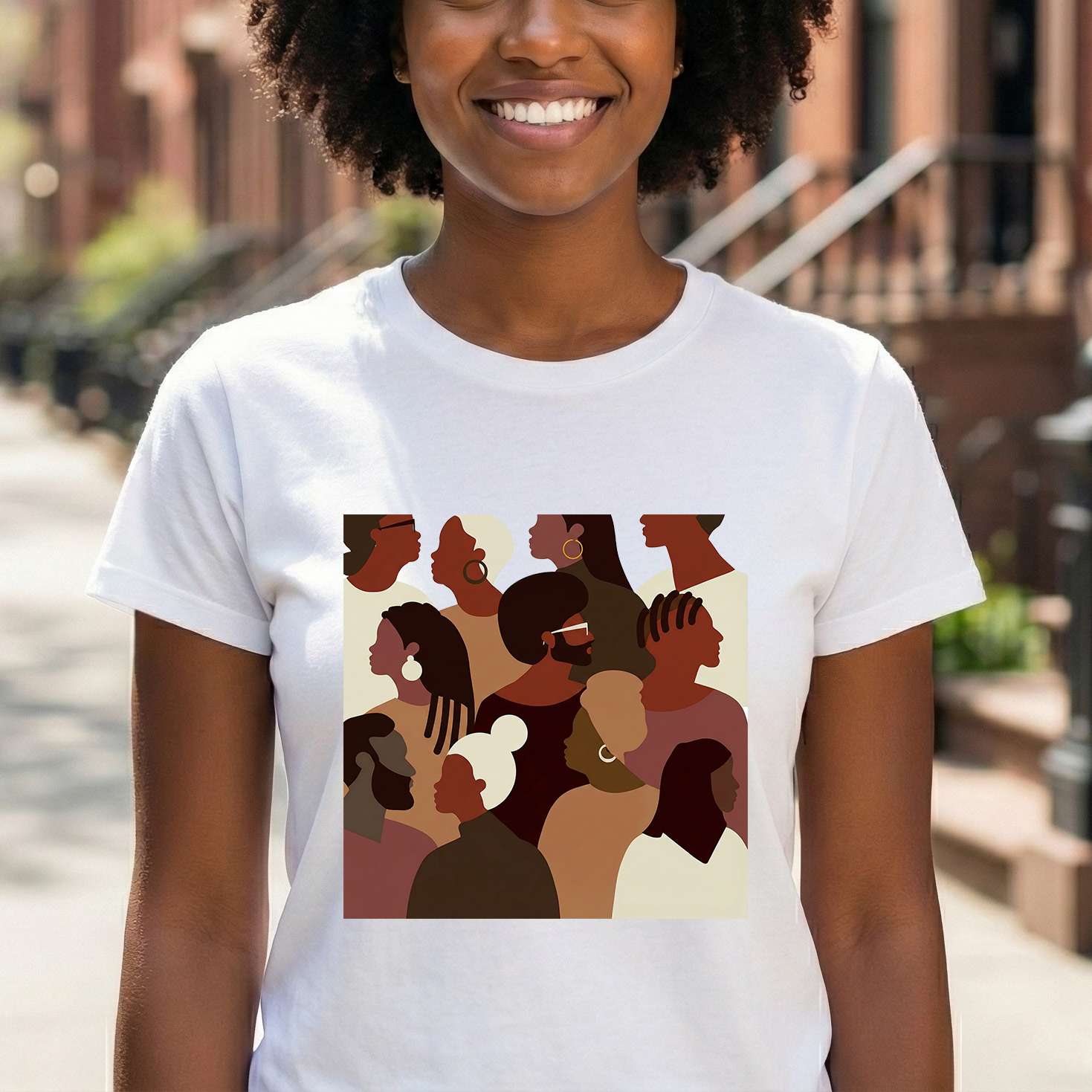 This sophisticated design features a stylized collage of profiles representing a variety of skin tones, hairstyles, and unique beauty. With a chic, earthy color palette of deep browns, soft tans, warm creams, and muted clay tones, it brings a high-end, gallery-worthy aesthetic to your apparel.
