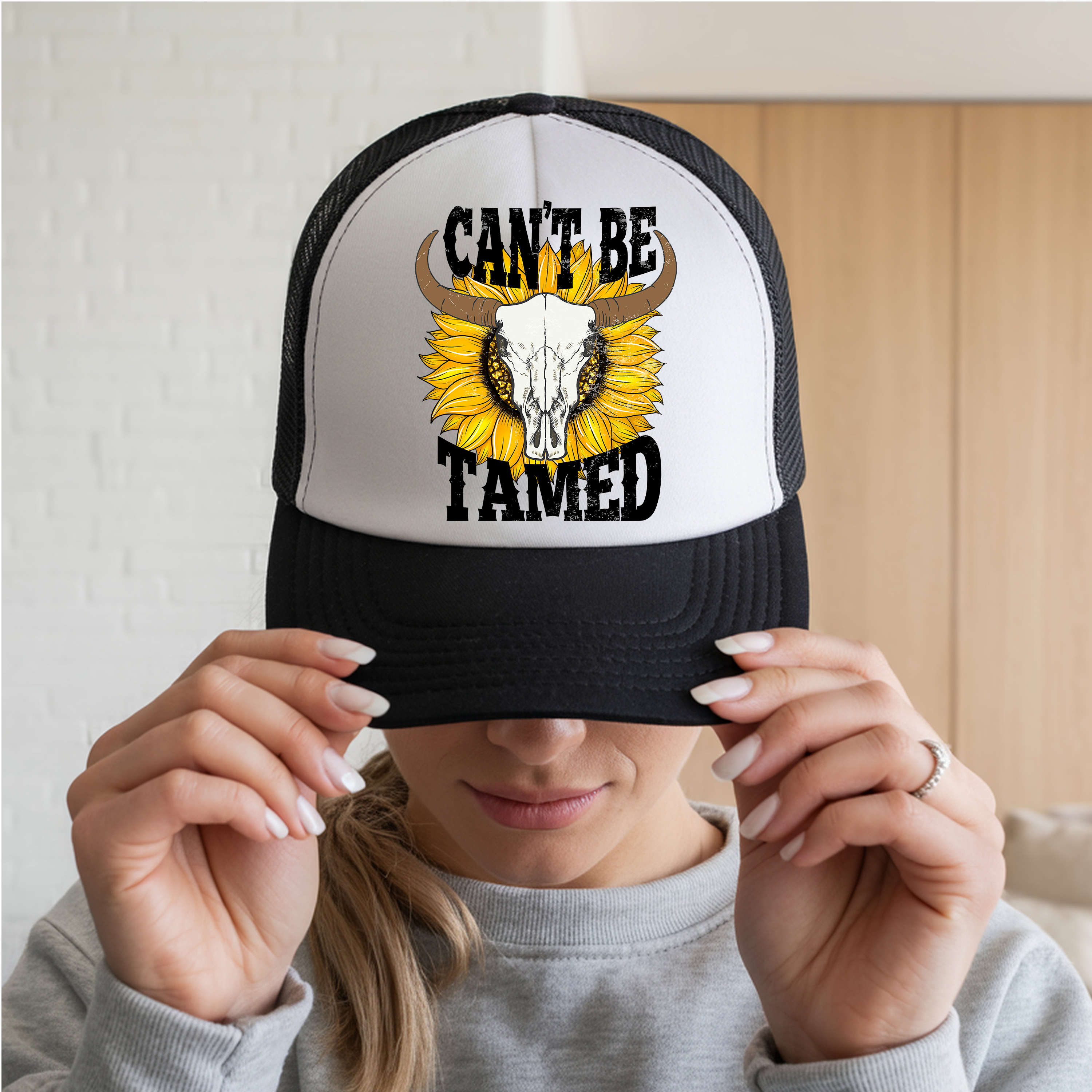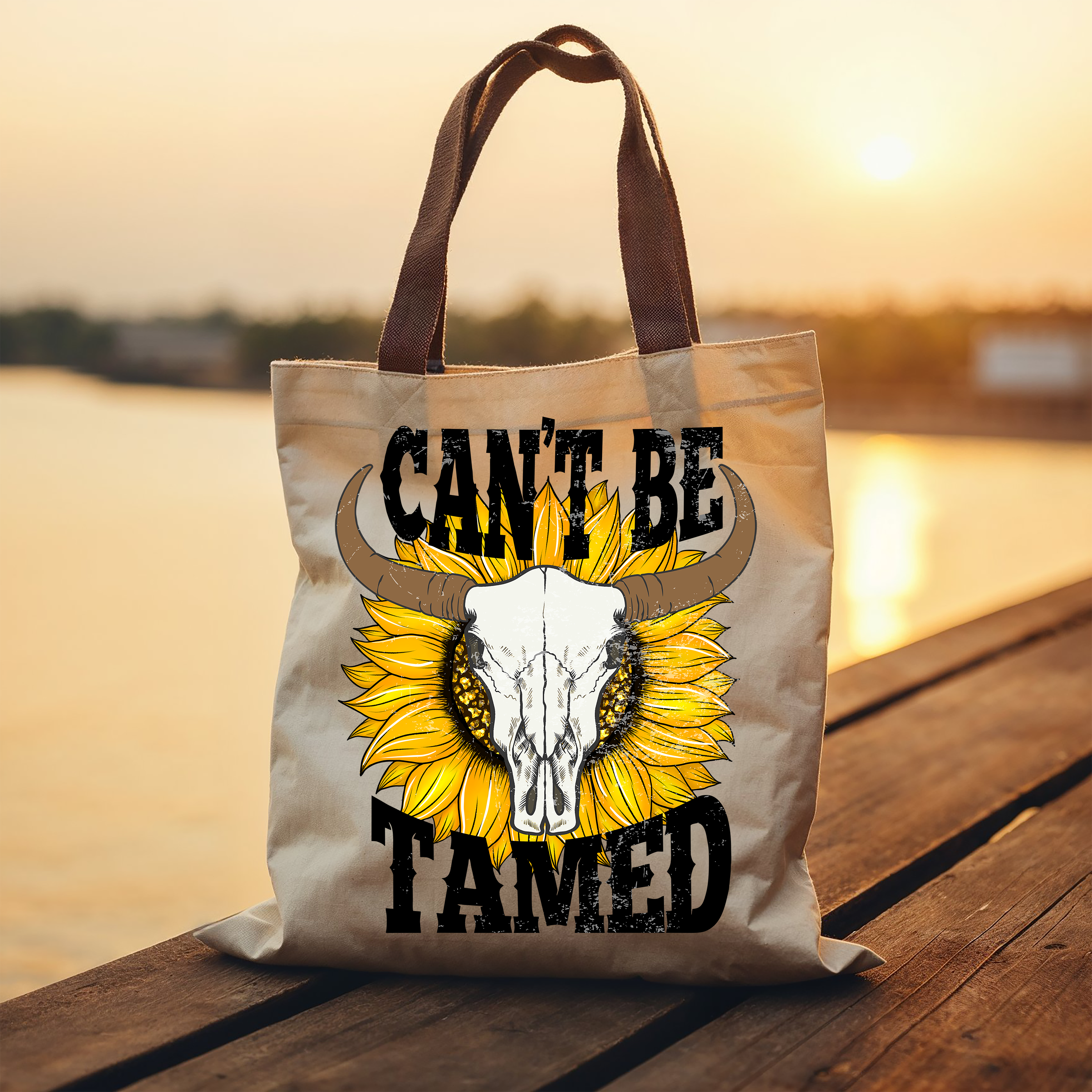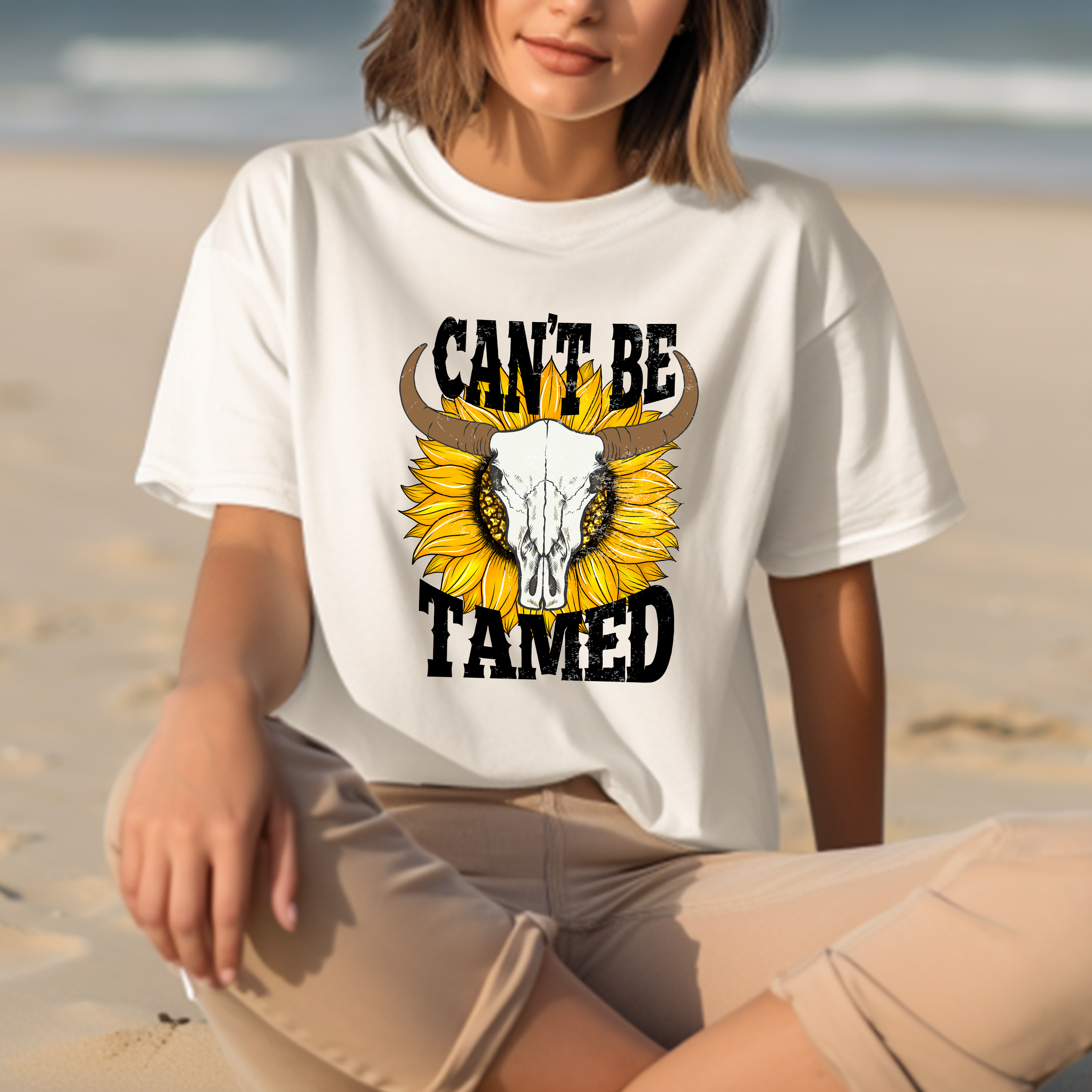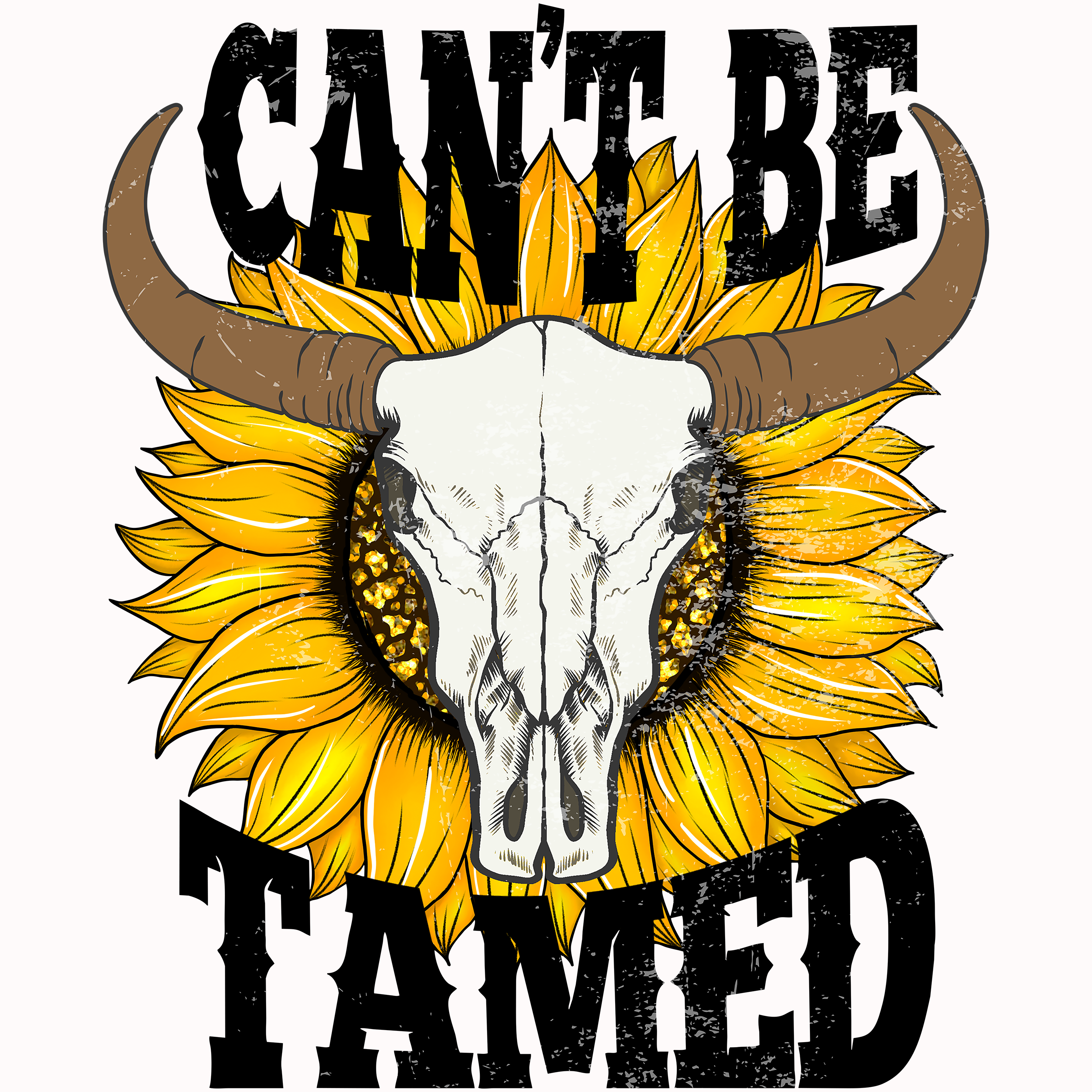 Get ready to press pure, unapologetic style! This high-quality DTF transfer is the perfect blend of tough and pretty. It features a bold, detailed bull skull layered over a bright, beautiful sunflower. The distressed, rodeo-style text "CAN'T BE TAMED" says it all.