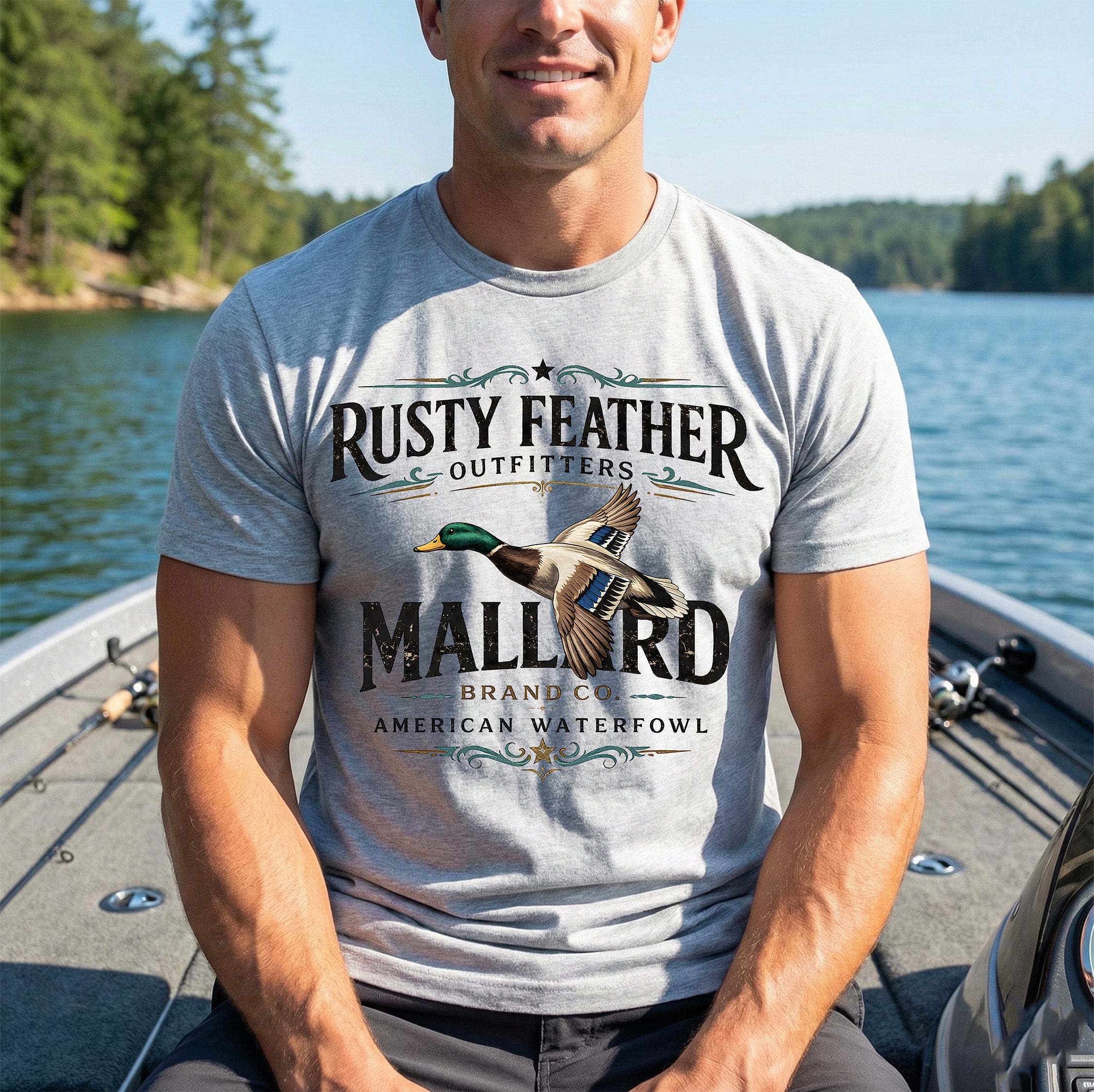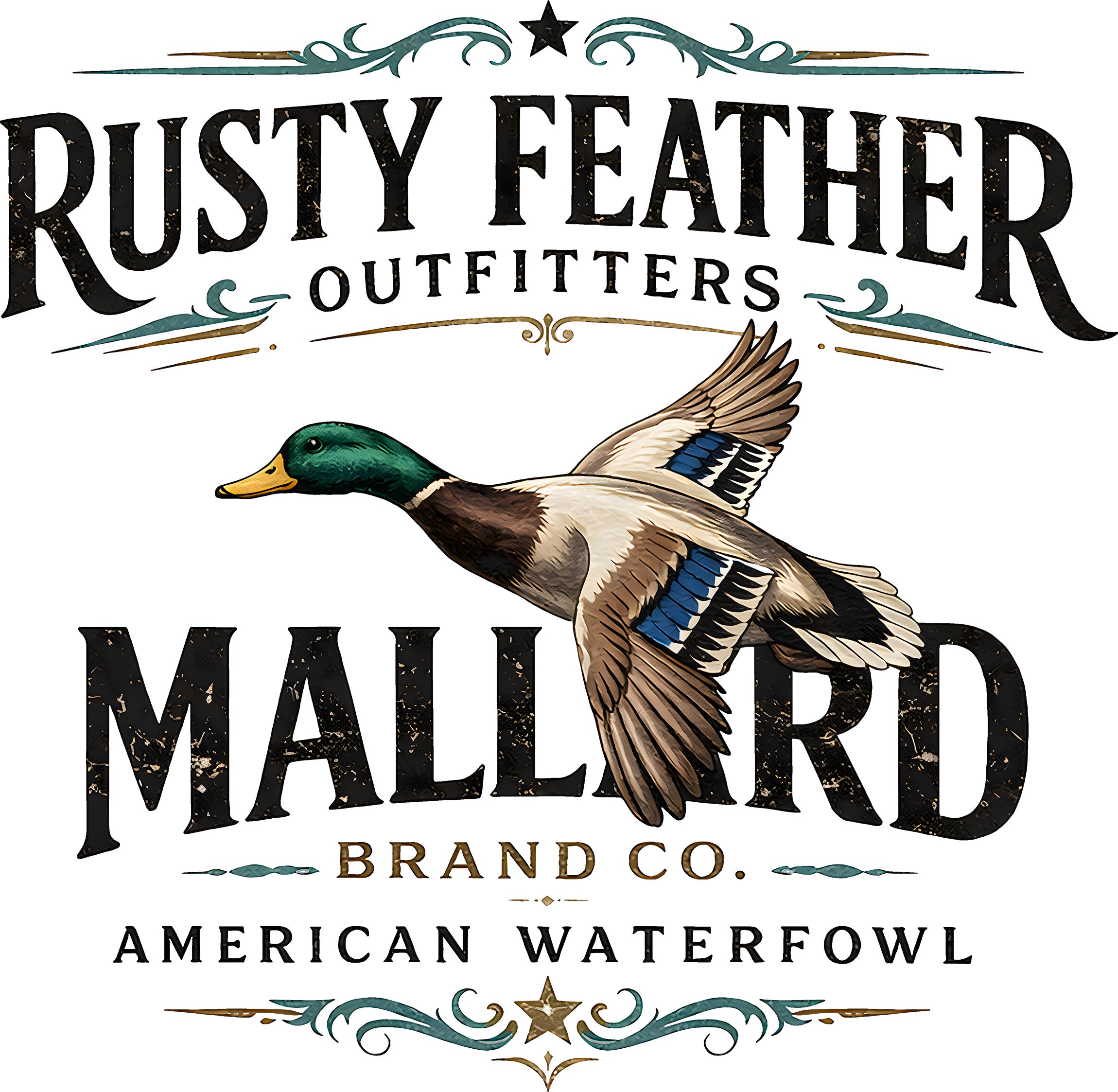 This vintage-inspired transfer features a stunning, realistic illustration of a Mallard duck in flight, showing off its signature green head and blue wing patch. The artwork is framed by elegant scrollwork and bold, distressed text that reads "RUSTY FEATHER OUTFITTERS" and "MALLARD BRAND CO. - AMERICAN WATERFOWL." Itโs the perfect rugged look for hunting gear, cooler decals, or your favorite everyday tee! ๐งข๐