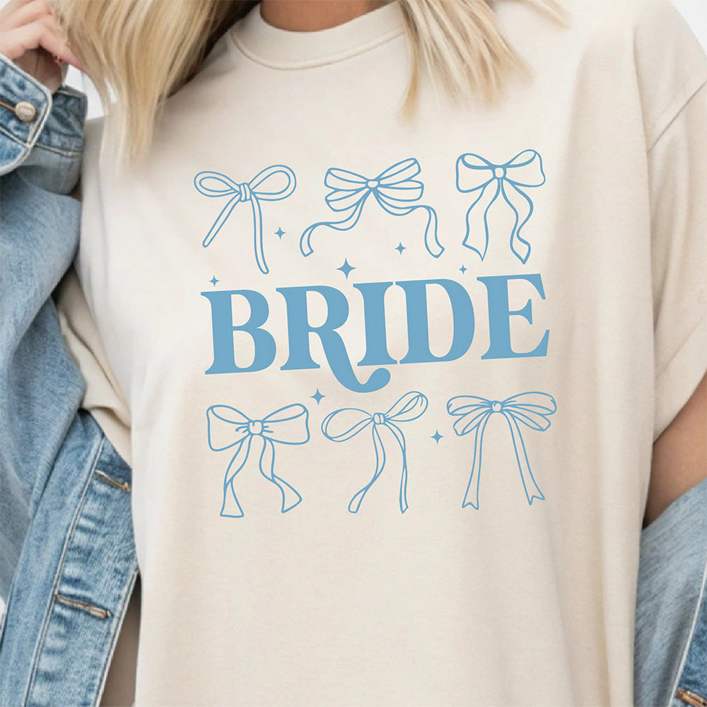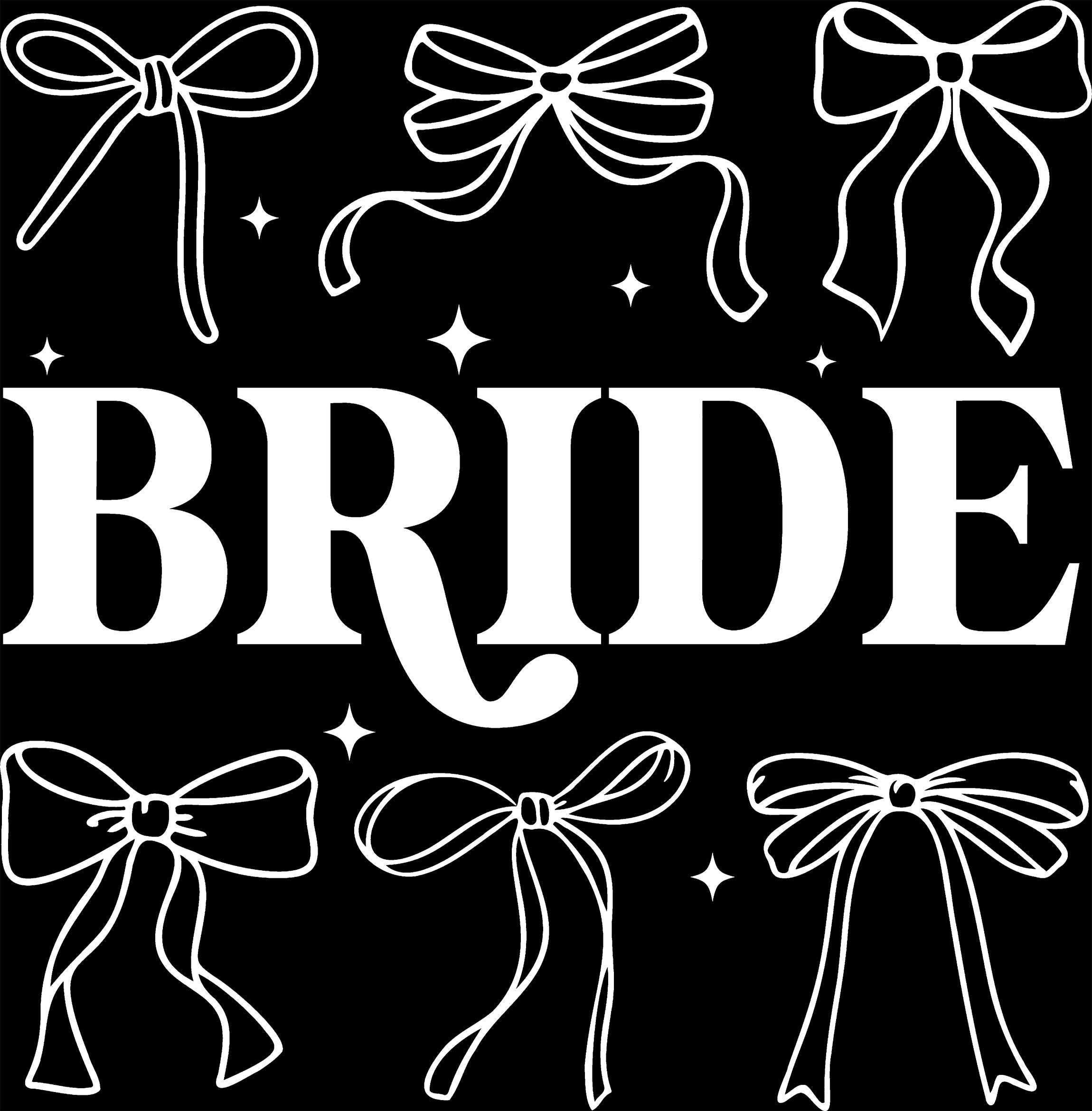 Calling all brides! 💍 It’s time to embrace your soft girl era with the ultimate bridal accessory. Our "BRIDE" DTF transfer features a trendy, bold typeface surrounded by a collection of dainty, hand-drawn coquette bows and sparkles. It is the perfect blend of high-fashion prep and wedding day bliss!