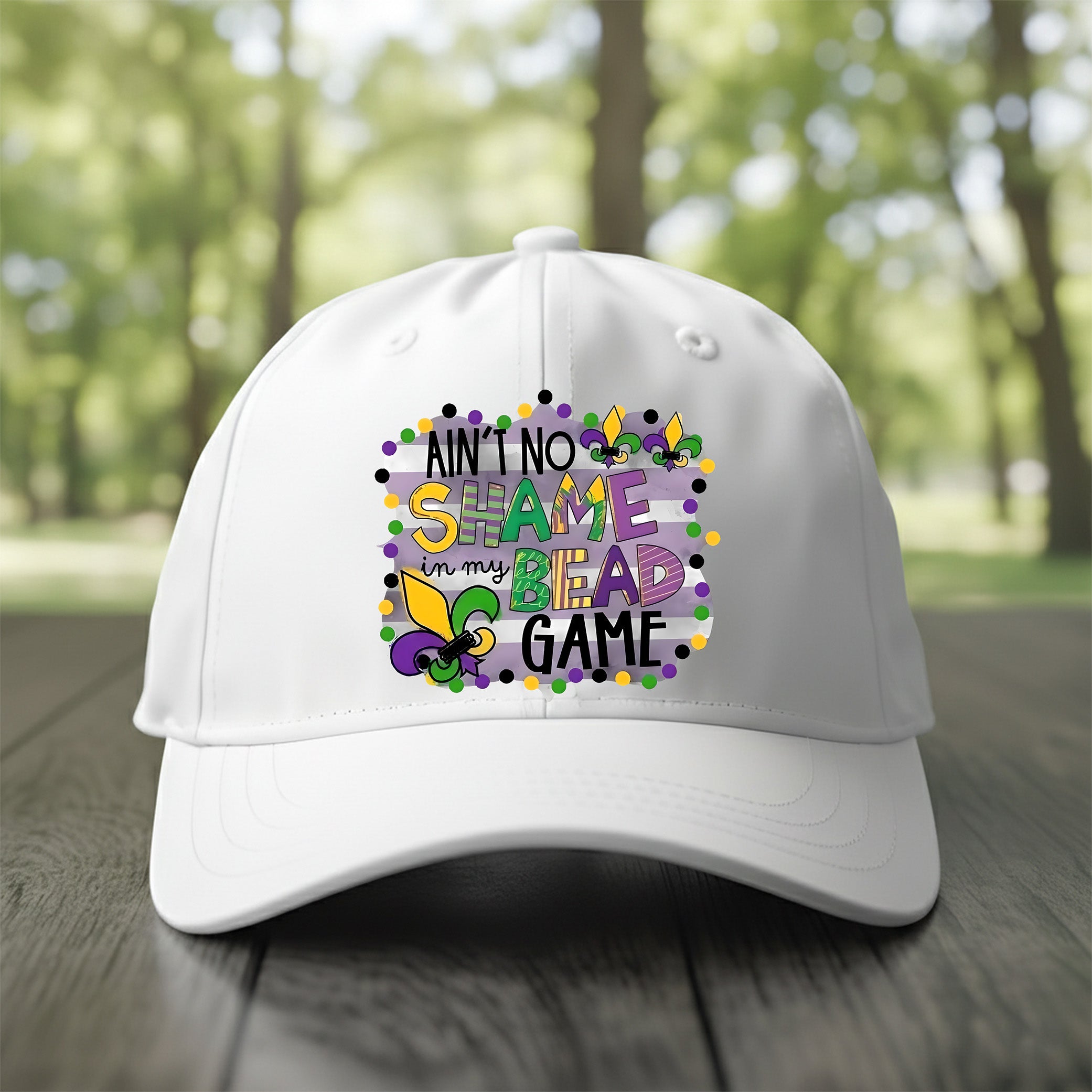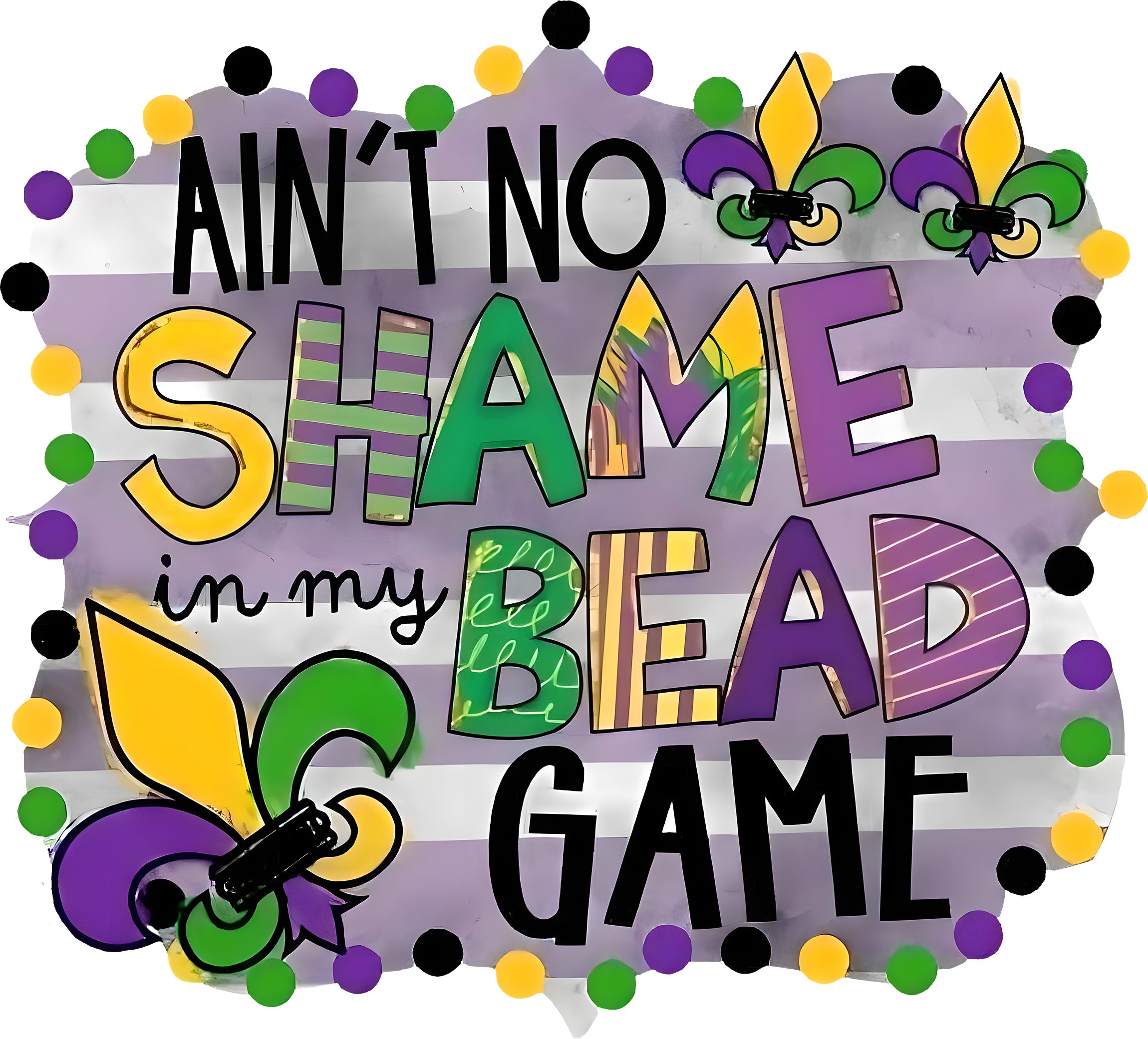 This festive transfer features the catchy phrase "AIN'T NO SHAME in my BEAD GAME" in bold, colorful block letters. Decorated with classic fleur-de-lis symbols and bordered by a string of beads on a purple and white striped background, it captures the true spirit of the French Quarter. π· Itβs the perfect design for catching throws, eating king cake, and partying on Bourbon Street!