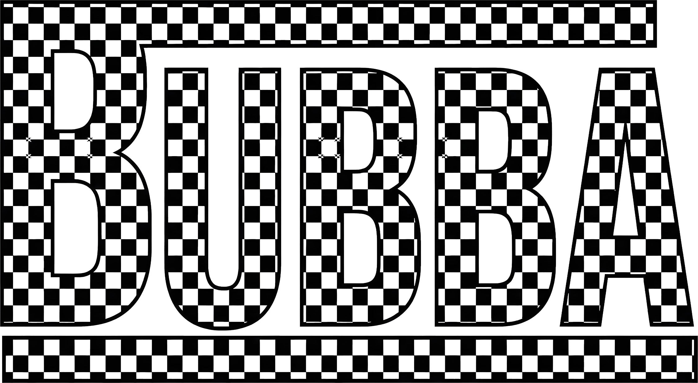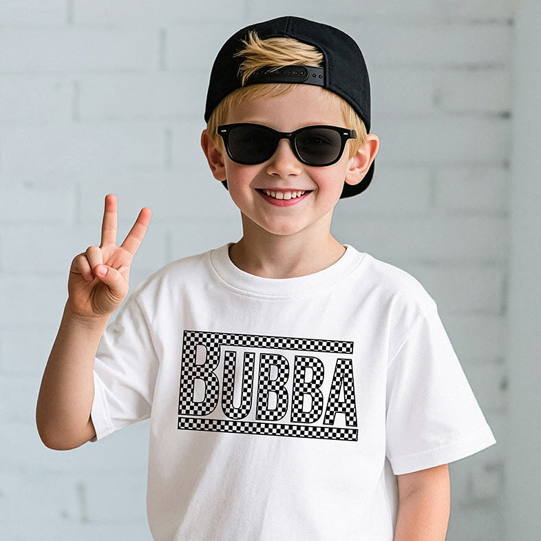 This awesome transfer features the name "BUBBA" in massive, bold block letters that demand attention. The entire design is decked out in a classic black and white checkerboard pattern, including stylish racing stripes above and below the text. Itโs a timeless, sporty look that goes perfectly with denim, joggers, or his favorite baseball cap! ๐๏ธ๐จ