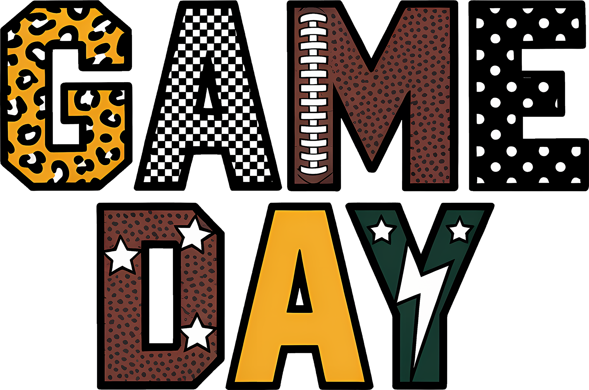 Why choose one pattern when you can have them all? This "GAME DAY" transfer is the ultimate mashup of trendy styles, perfect for the fan who brings the energy (and the fashion) to the stadium!