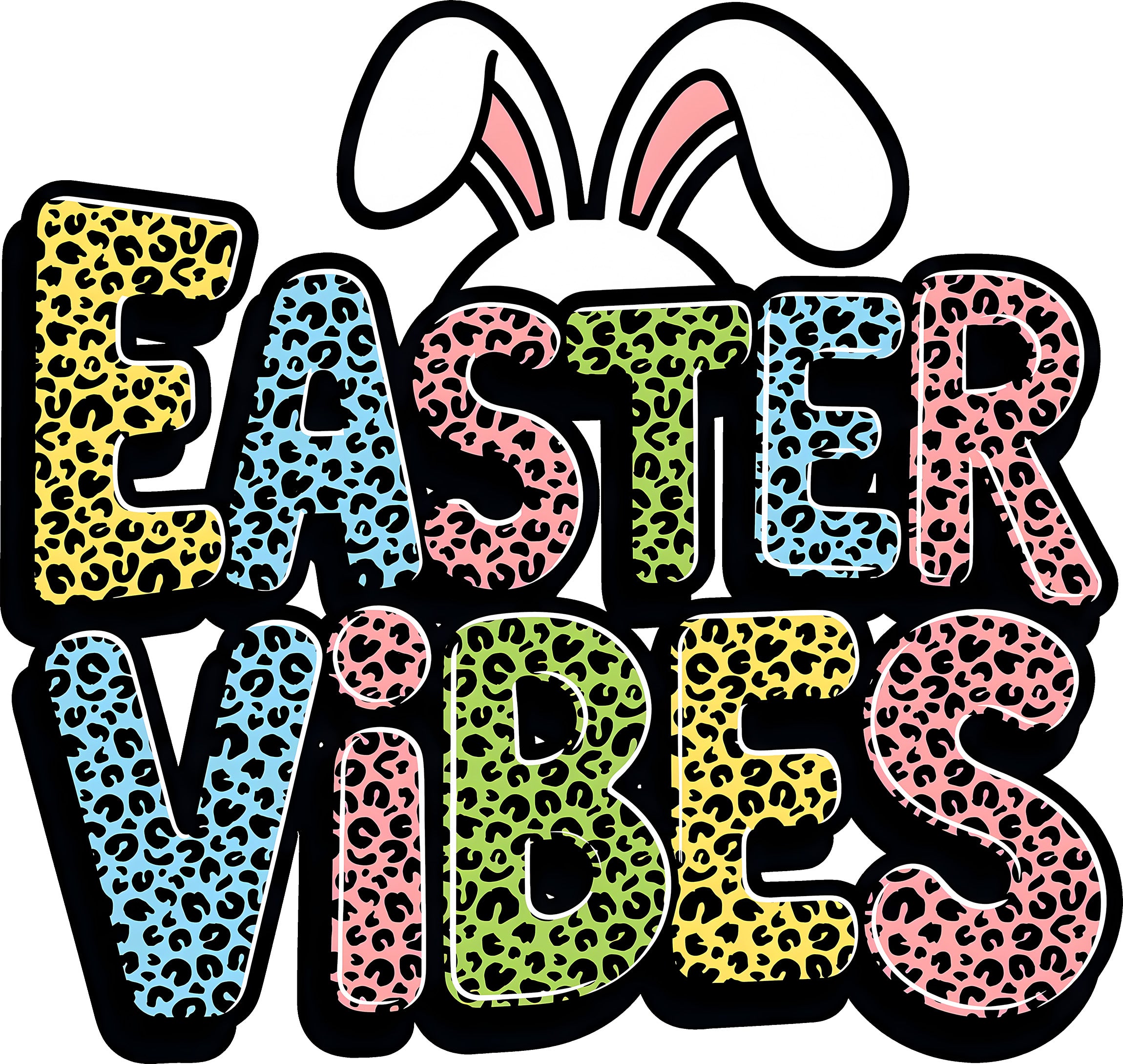 This trendy design features the phrase "EASTER VIBES" in big, bold bubble letters, each filled with a different vibrant leopard print pattern—bright yellow, teal blue, hot pink, and lime green! Topping it all off is a pair of adorable white bunny ears peeking out from behind the text. It’s the perfect mashup of cute and cool for your holiday wardrobe!