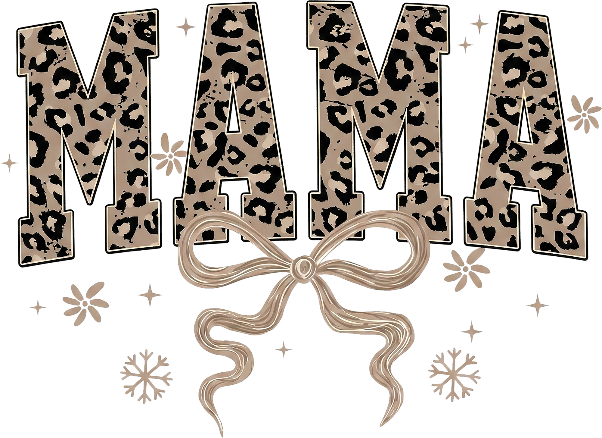 This stunning design features bold "MAMA" block letters filled with a classic, high-definition leopard print. To add a soft, trendy touch, a beautiful metallic-style beige ribbon bow sits front and center, while subtle sparkle accents dance around the letters.