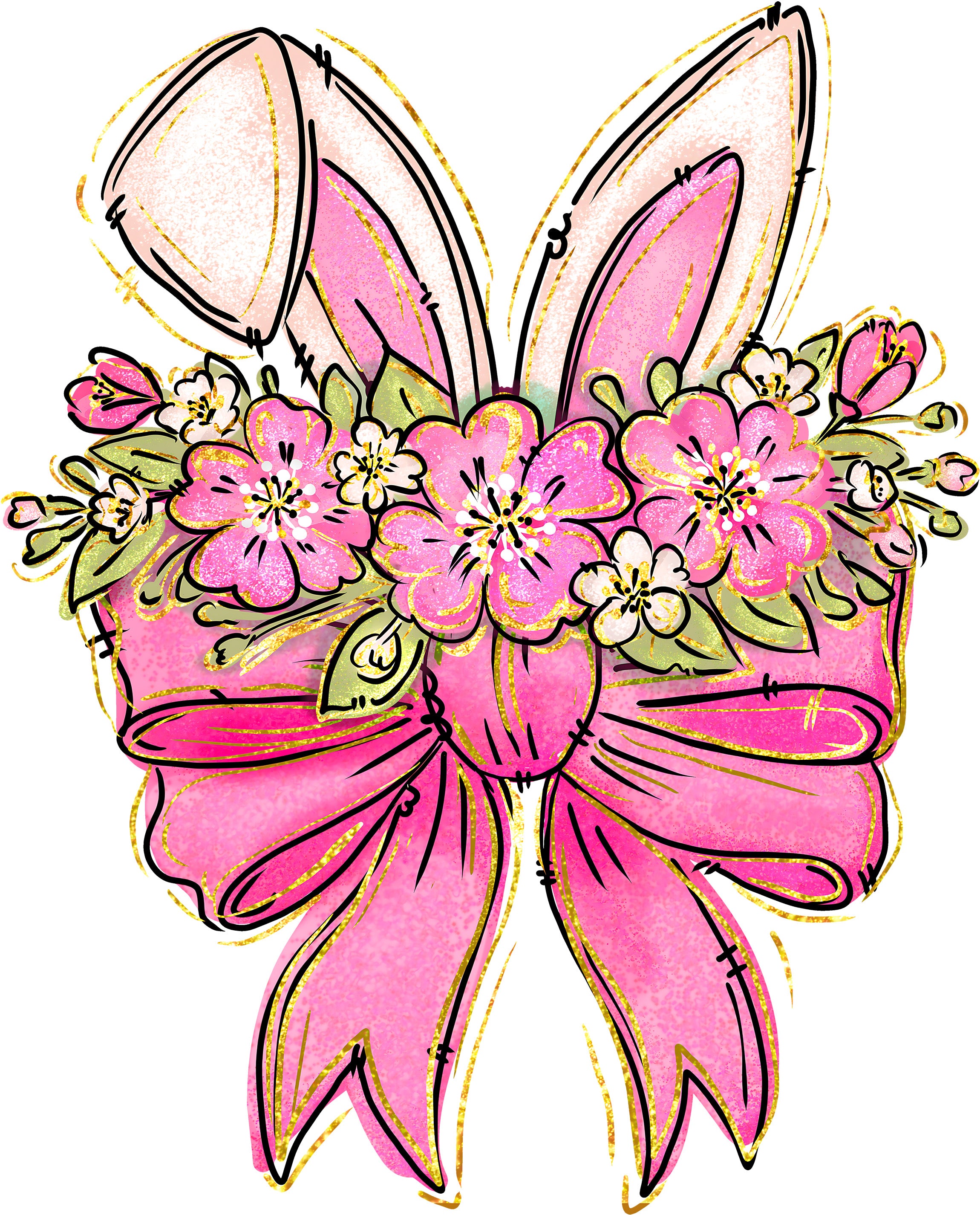 This gorgeous transfer features a pair of white bunny ears (with one cute floppy ear!) nestled behind a lush bouquet of vibrant pink flowers and green leaves. Tied together with a massive, stylish pink bow and outlined in a trendy faux-gold glitter sketch style, it offers a high-end, boutique look that is simply adorable. Itโs perfect for little girls' dresses, tote bags, or a matching "Mommy and Me" Easter set!