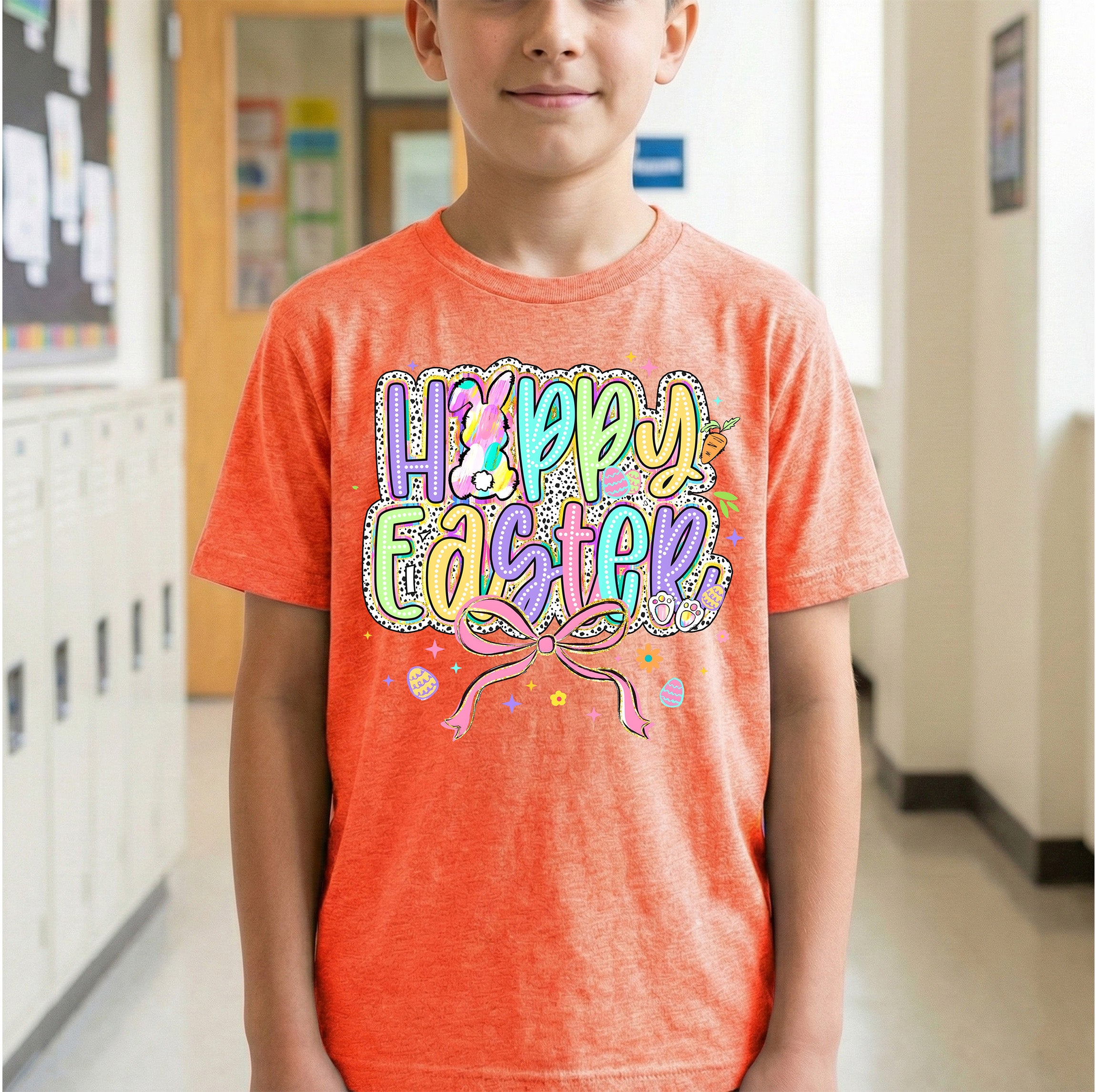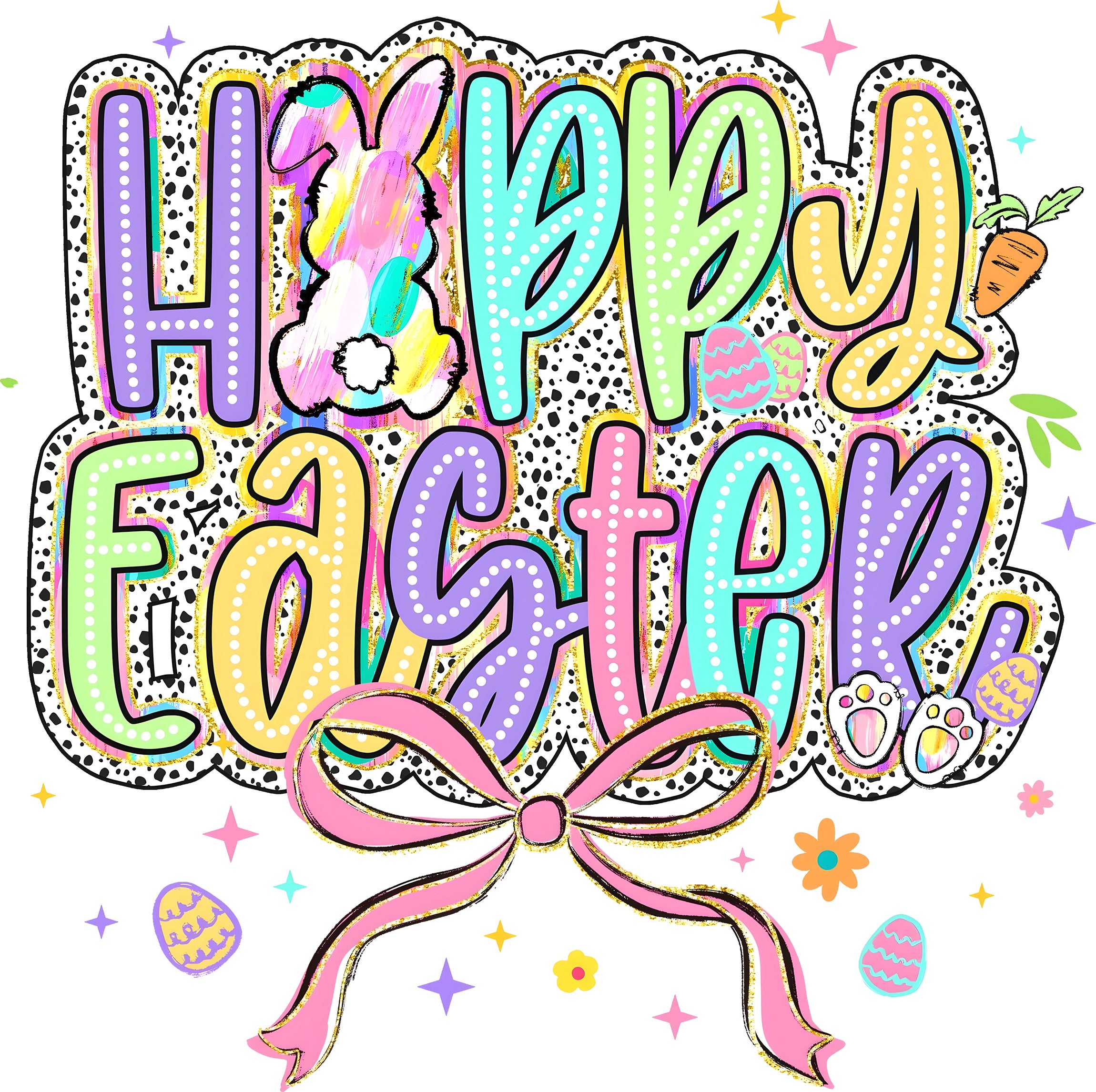 This maximalist transfer features the words "HAPPY EASTER" in large, playful bubble letters filled with polka dots, stripes, and bright pastels like purple, teal, lime green, and yellow. The "A" in "Happy" is replaced by a colorful, swirly bunny silhouette, and the whole design sits on a trendy black-and-white speckled background. Finished with a big pink bow, a carrot, and cute bunny feet, it’s a festive masterpiece! 🥕🎀