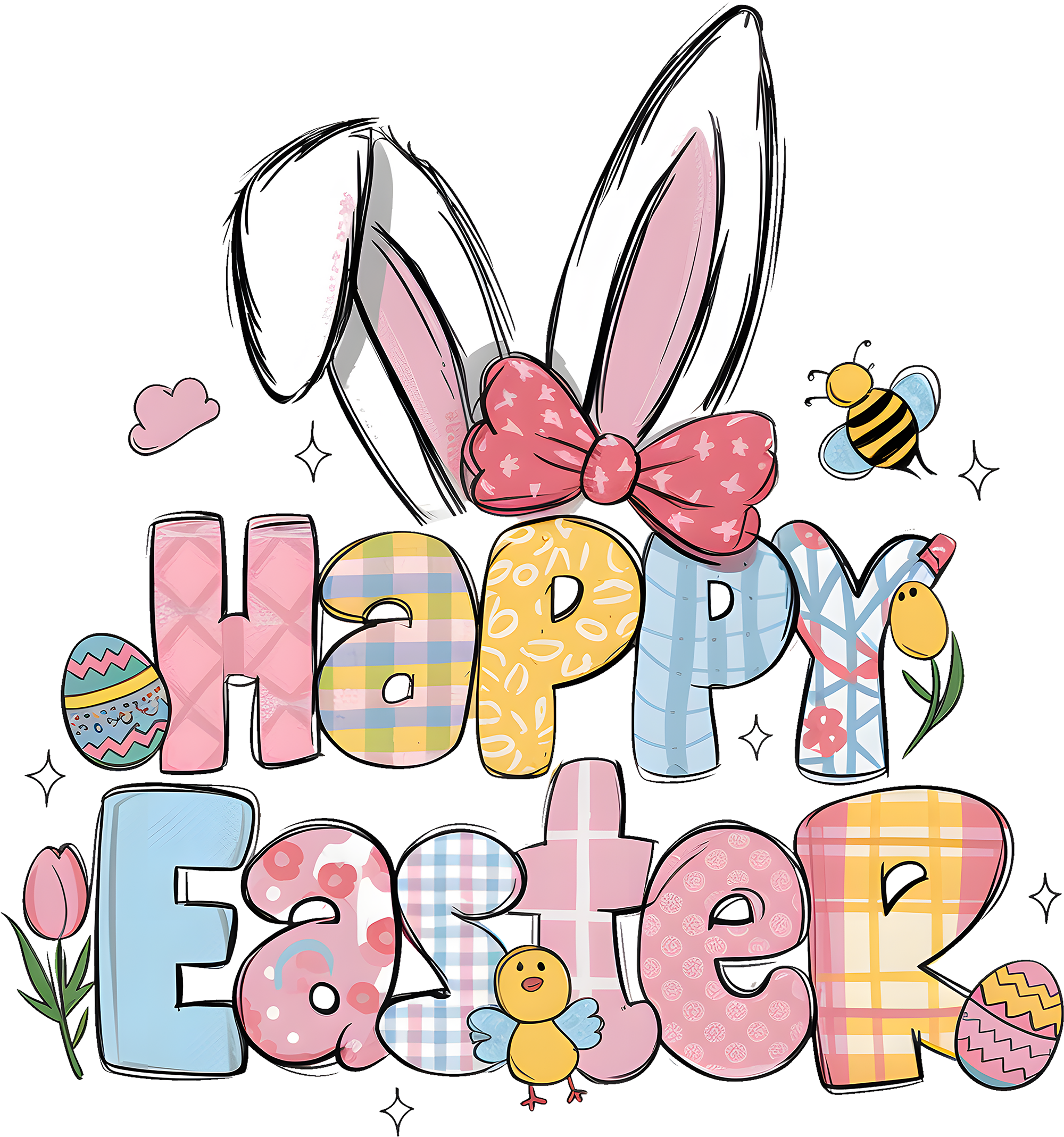Hop into the season with the cutest design of the year! Our "Happy Easter" DTF transfer is bursting with Spring vibes, featuring playful bubble letters mixed with charming plaids, polka dots, and sweet little hearts.