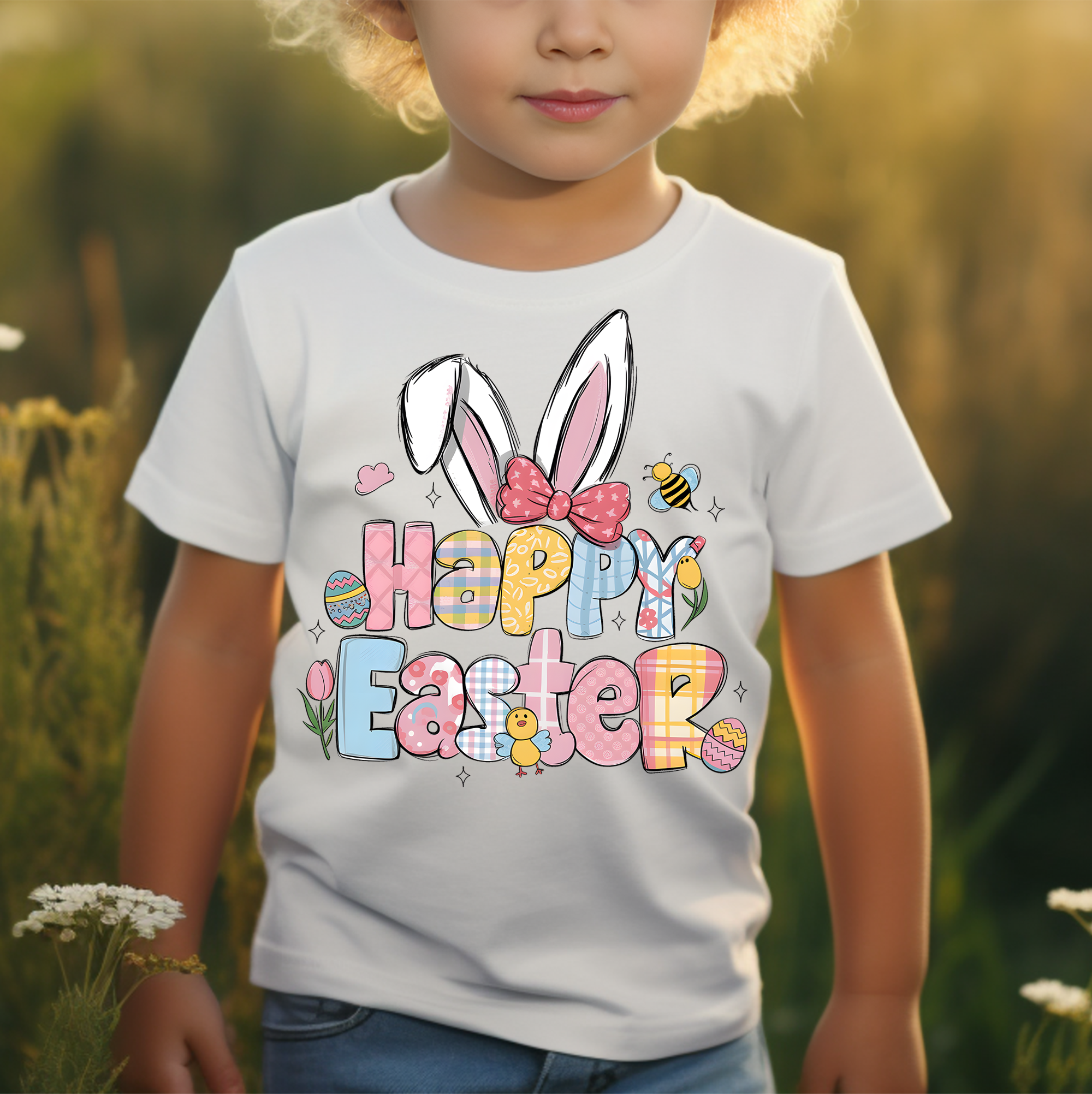 Topped with a pair of big, fluffy bunny ears and a pink bow, and surrounded by buzzing bees, blooming tulips, and a little yellow chick, this design is pure happiness! Whether you are making matching family tees, a cute tote bag for an egg hunt, or a festive onesie, this transfer is sure to be an "egg-cellent" hit.