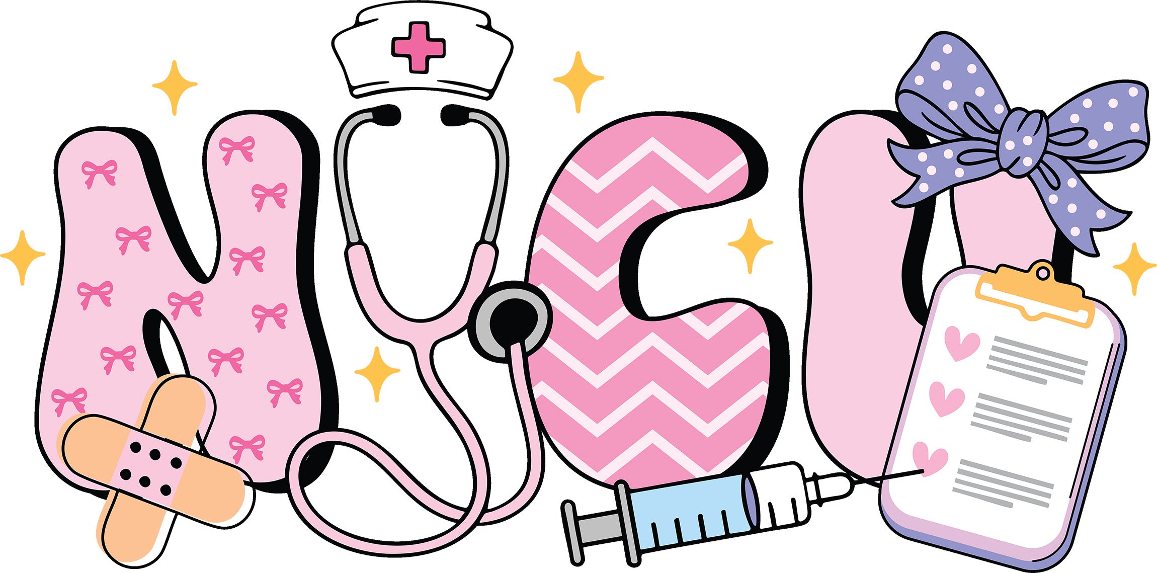 This charming transfer spells out "NICU" in big, bubbly pink letters, each packed with cute details.