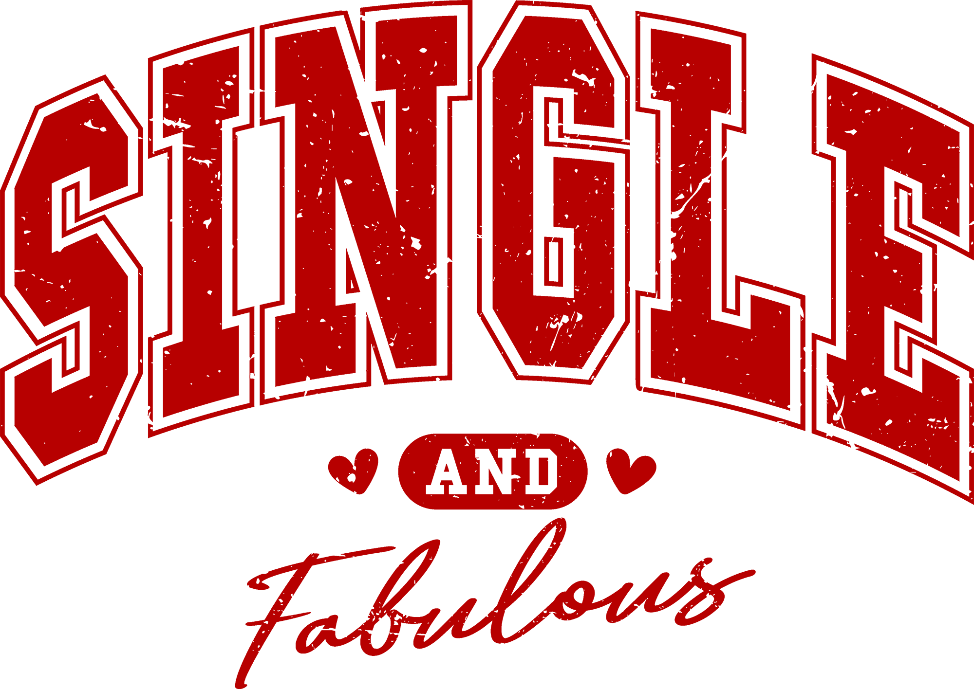 This design features a cool, retro varsity aesthetic with the word "SINGLE" in large, athletic block letters. Below it, "AND Fabulous" is written in a stylish script, flanked by two cute hearts. The entire design is rendered in a bold deep red with a trendy distressed texture, giving it that perfect vintage, lived-in look right off the press.