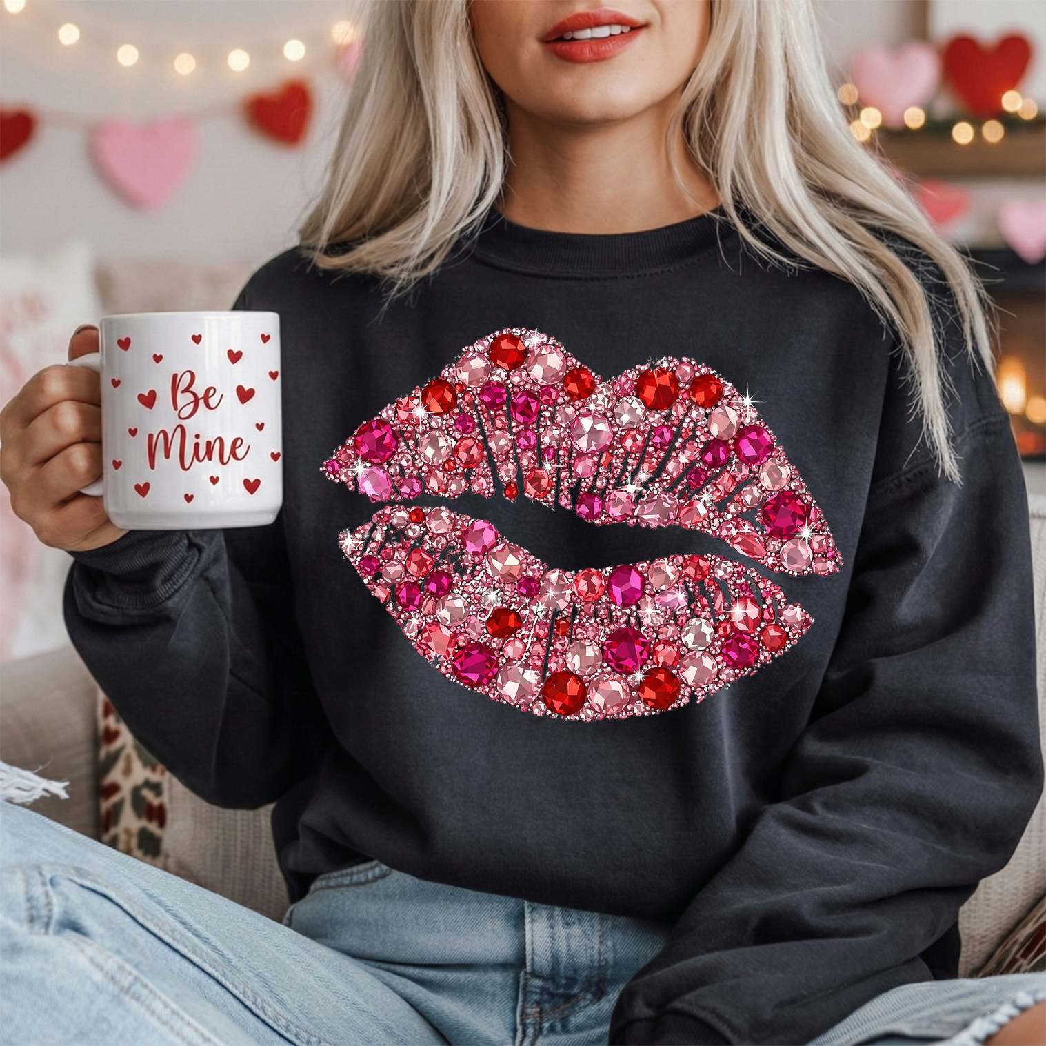 Get that million-dollar look without the heavy price tag (or the loose stones)! Our "Gemstone Kiss" DTF transfer features a stunning, high-resolution lip design made of faux red and pink gemstones. It captures all the glitz and glam of real rhinestones in a smooth, durable print.
