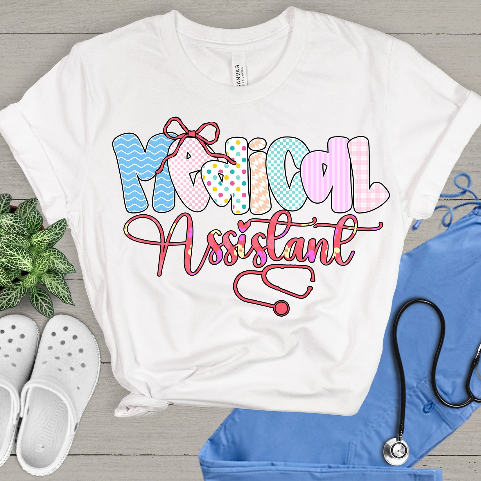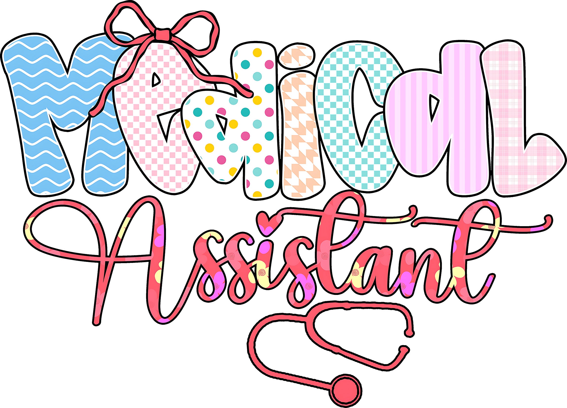 This fun transfer features the word "Medical" in large, playful bubble letters, each filled with a unique pattern—from blue waves and pink plaid to polka dots and houndstooth! The word "Assistant" is written below in a lovely pink script with floral details, seamlessly connecting to a heart-shaped stethoscope. Topped off with a sweet pink bow, this design is as capable and cute as you are! 🎀💊 Whether you're in the clinic or off the clock, this design looks amazing on both dark and light shirts.