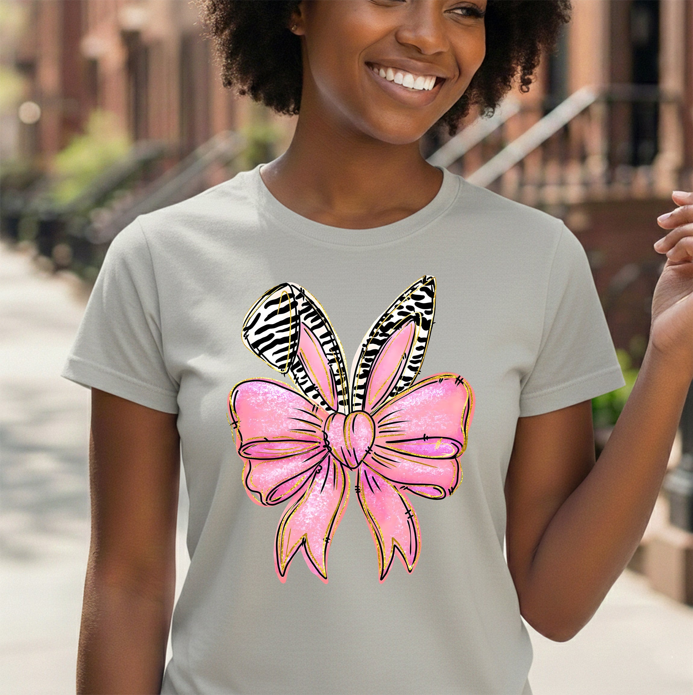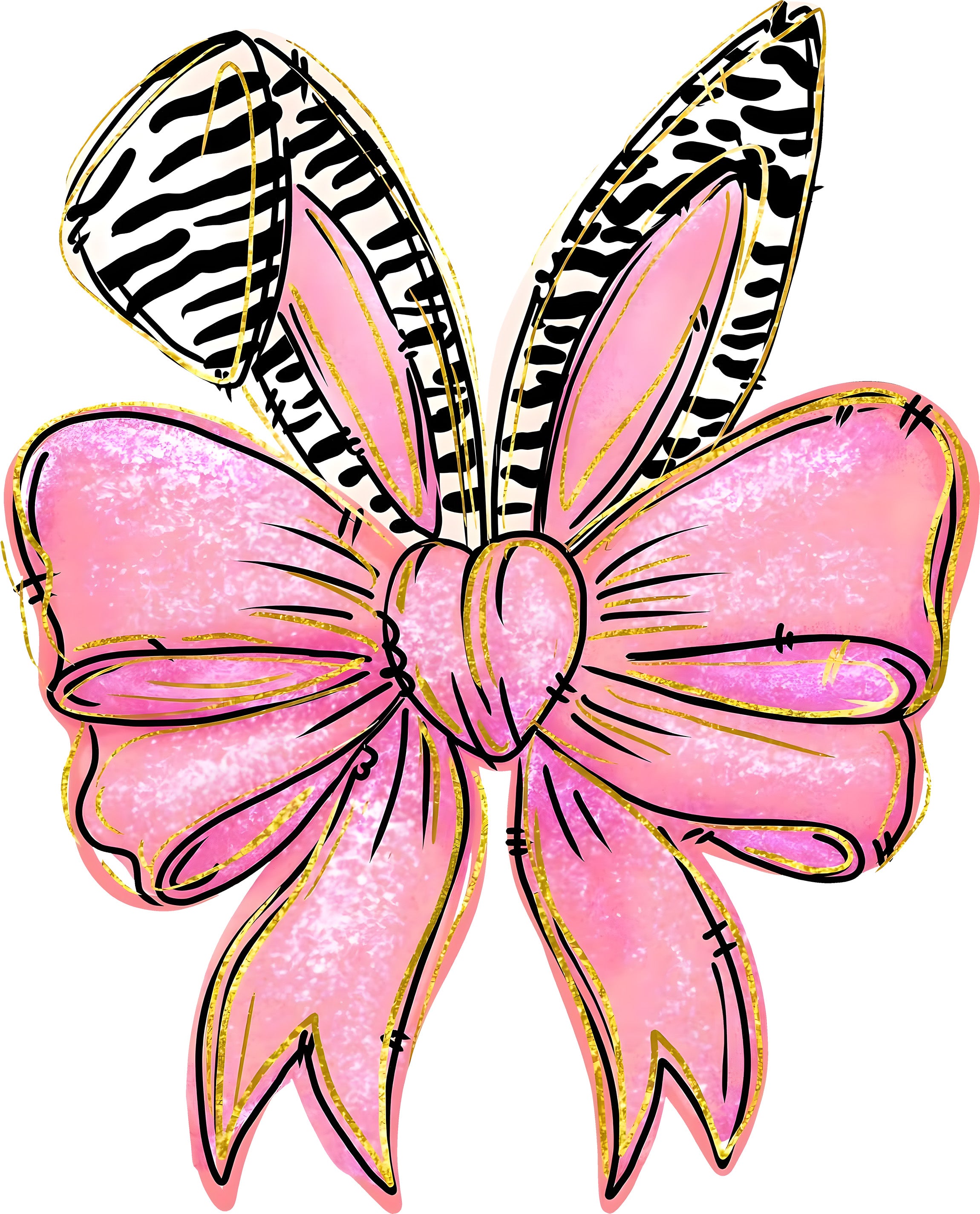 Featuring a massive, shimmering pink bow with a cute heart knot, this transfer gets a wild upgrade with bold black-and-white zebra print bunny ears! ๐ Finished with luxurious gold sketch outlines to make it pop, this design screams "Fashionista." Itโs the perfect mix of the viral coquette bow trend and animal print flairโideal for matching mommy-and-me tees or adding some sparkle to a denim jacket!