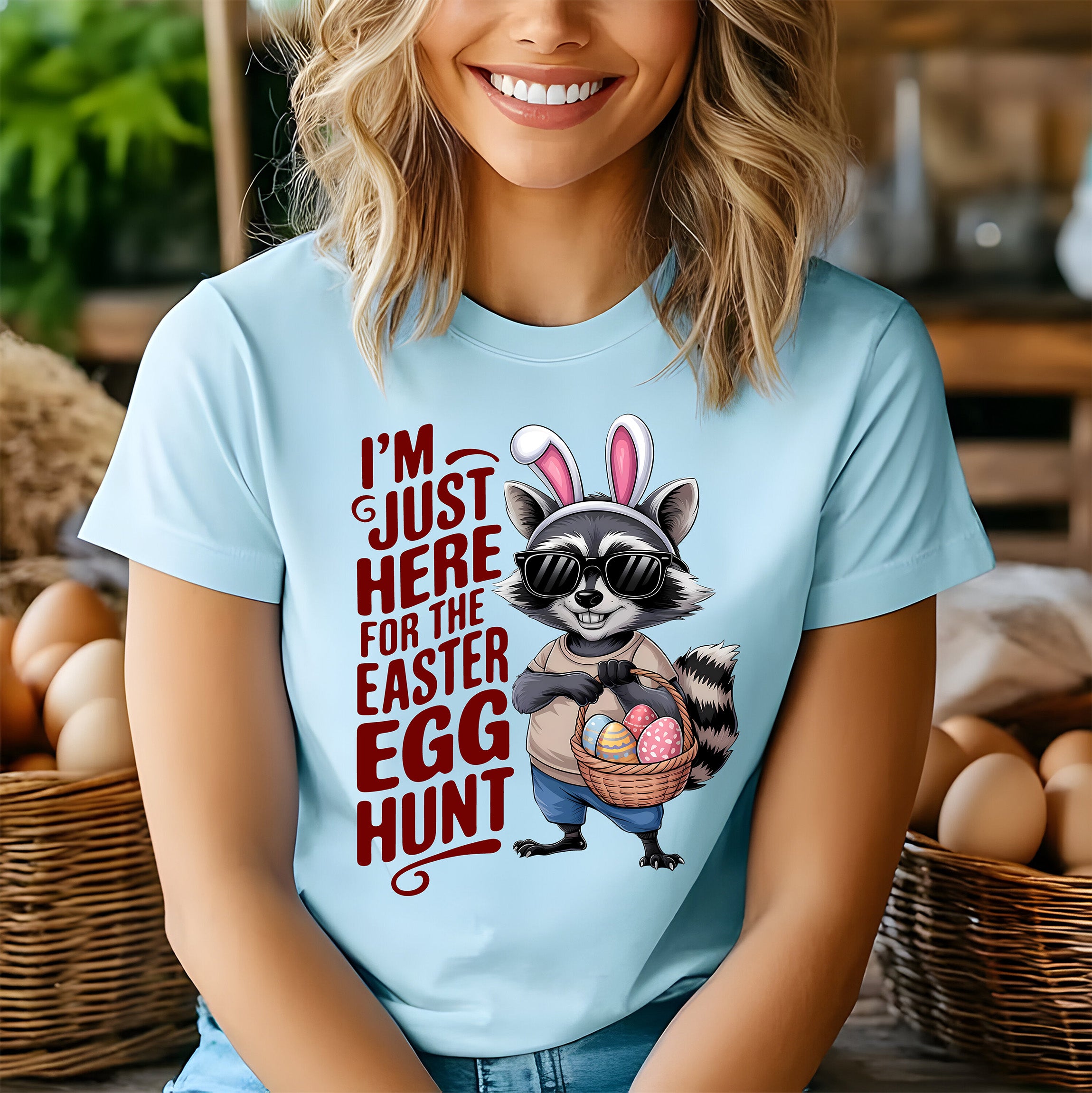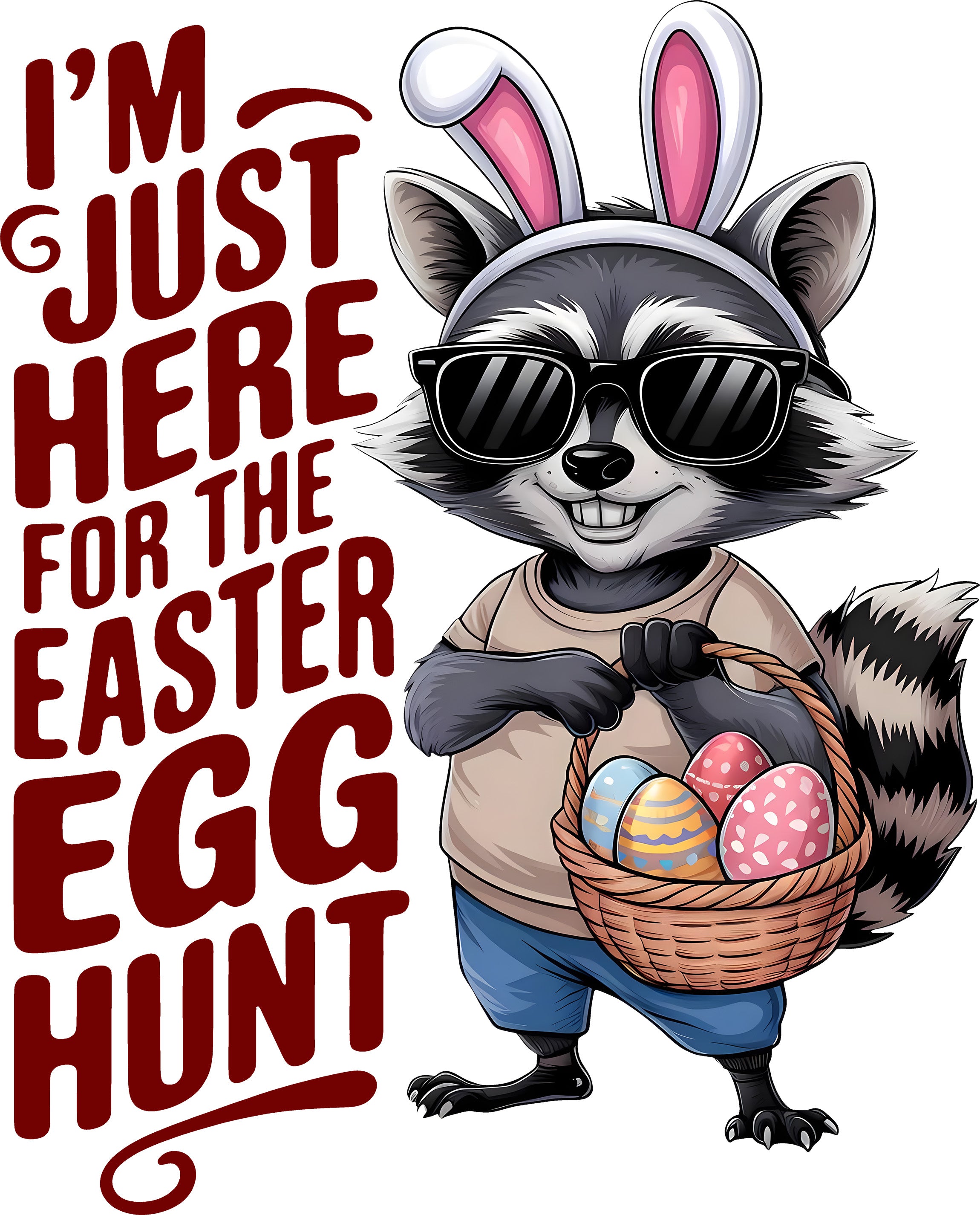 This funny transfer features a mischievous raccoon going "undercover" with pink bunny ears and dark sunglasses. Holding a basket full of colorful eggs, he's ready to sweep the field! With the bold declaration "I'M JUST HERE FOR THE EASTER EGG HUNT," this is the perfect shirt for kids determined to win the hunt, or adults who are just waiting for the candy! 🍬🦝