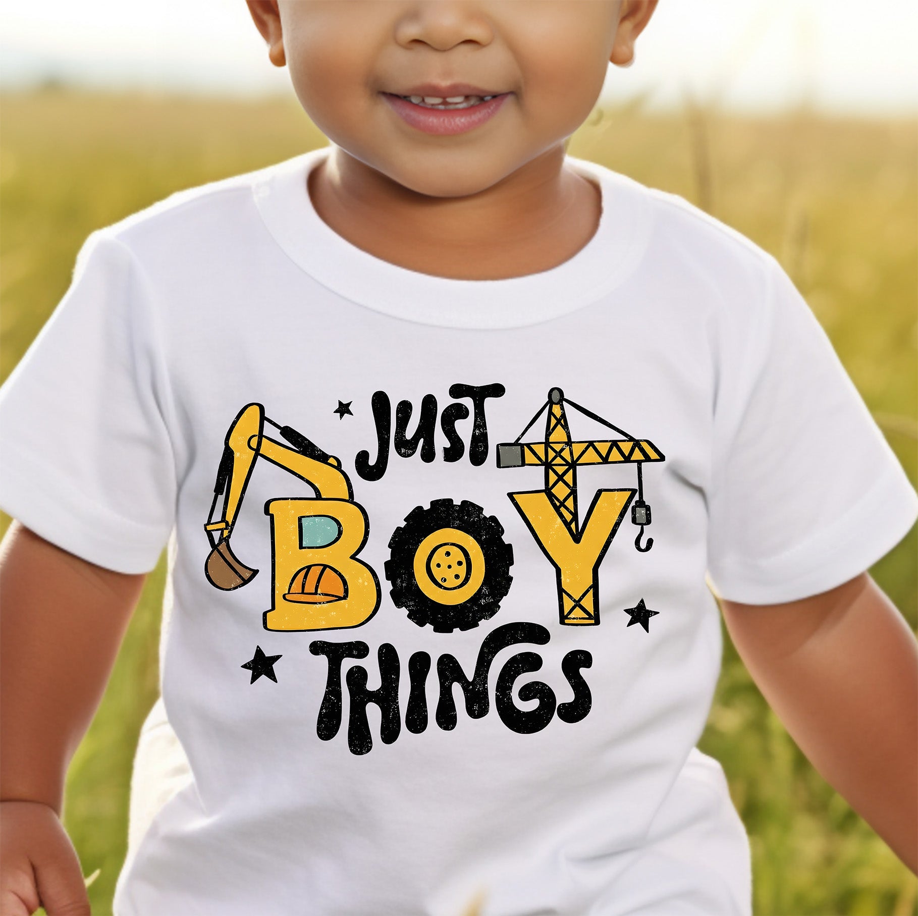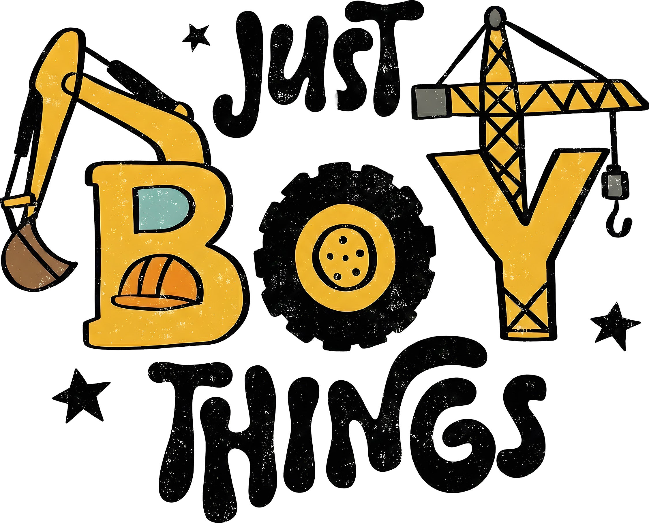 This creative design features the playful phrase "Just BOY THINGS" in bold, wavy text. The best part? The word "BOY" is built entirely out of construction gear!
