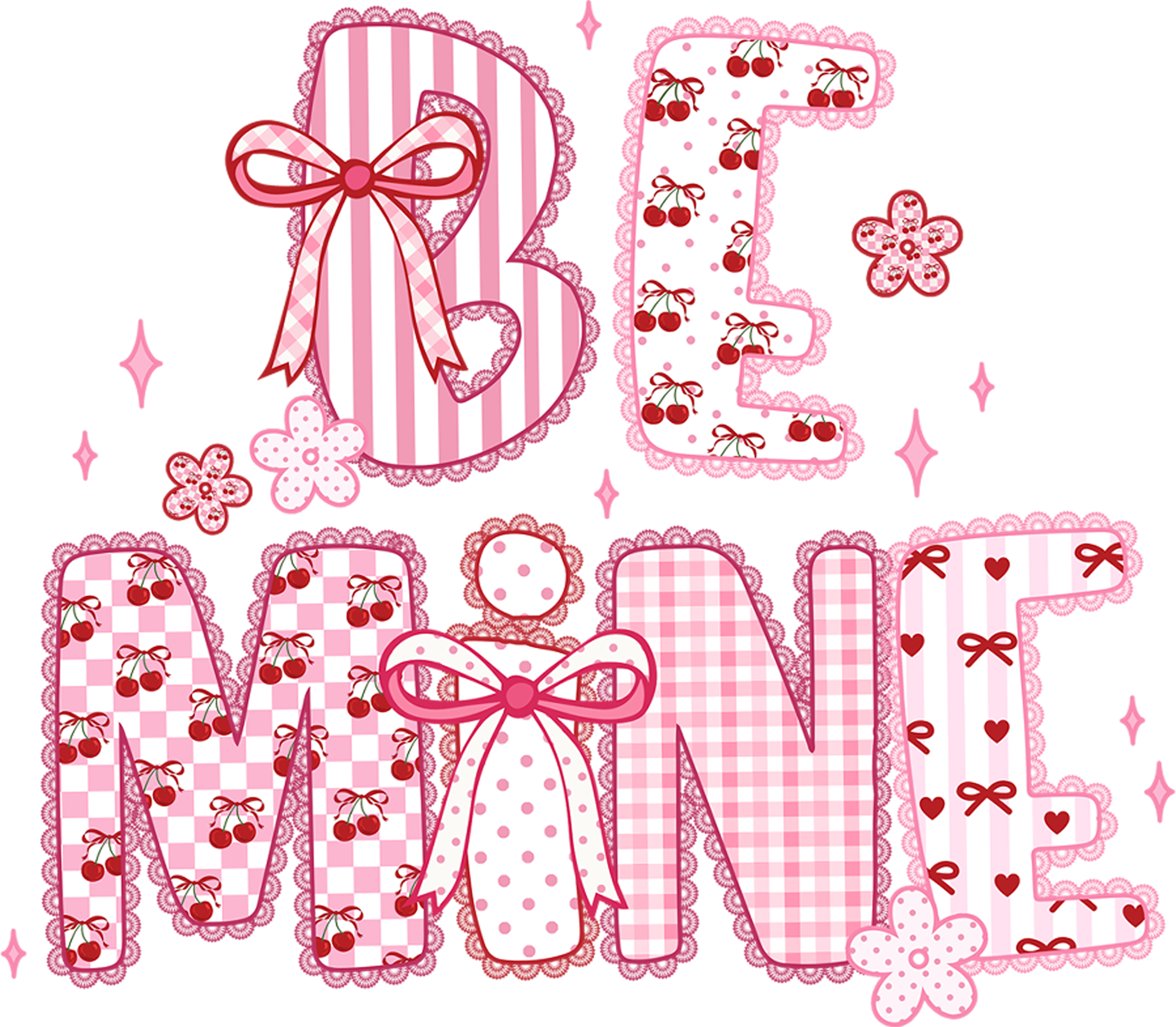 Get ready to swoon over the cutest Valentine's design of the year! Our "Be Mine" DTF transfer is a total coquette dream come true. This playful design features a patchwork style where every letter brings a different vibeโfrom classic pink gingham and candy stripes to adorable red cherries and polka dots.